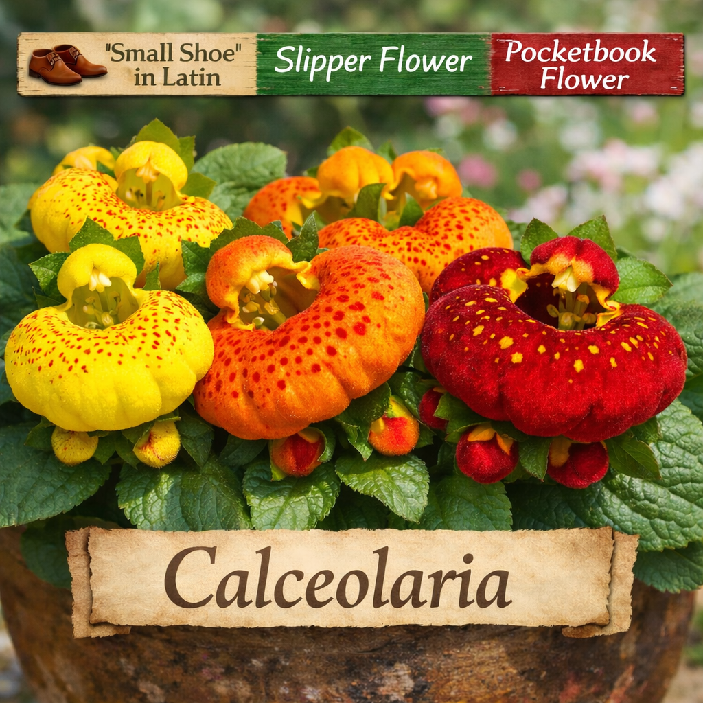 학명 Calceolaria는 라틴어 calceolus(작은 신발, 슬리퍼)에서 비롯되었습니다. 영어권에서는 ‘슬리퍼 플라워’, ‘포켓북 플라워’라 부르며, 우리말로는 복주머니꽃이라는 이름이 붙었습니다. 이름만 들어도 이 꽃이 얼마나 구체적인 형상을 지녔는지 짐작할 수 있습니다.