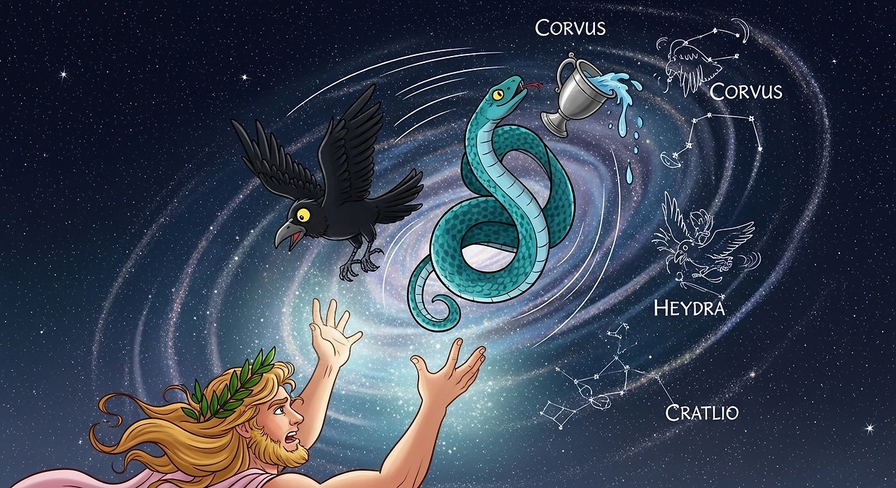 결국 늦어진 이유를 감추기 위해 물뱀을 잡아 거짓말을 하게 되고, 분노한 아폴로는 까마귀와 물뱀, 그리고 물컵을 하늘로 던져 별자리로 만들었다고 전해집니다. 오늘날 까마귀자리(Corvus)와 바다뱀자리(Hydra)의 기원이 바로 이 이야기에서 비롯됩니다.