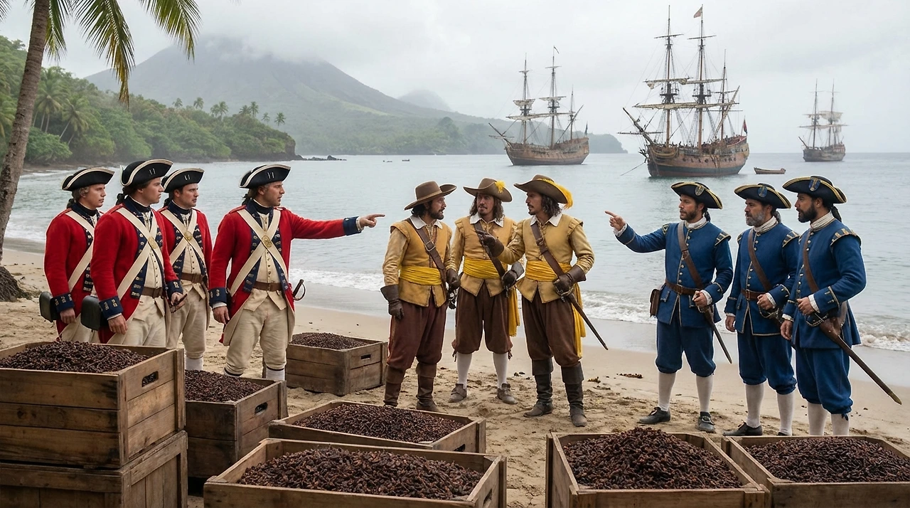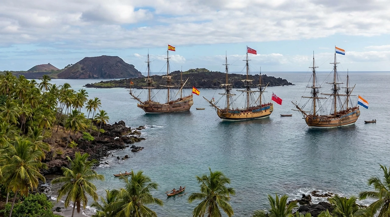 유럽의 여러 나라들은 이 작은 섬들을 차지하기 위해 서로 경쟁했습니다. 바다에서는 무장한 배들이 서로 대치했고, 항구에서는 군인들이 상륙했습니다.