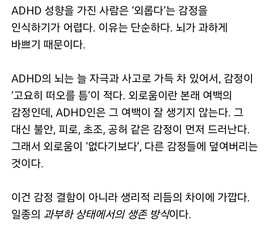 사람들은 흔히, '외롭겠다'라고 생각할 수 있다. 그런데 이상하게 나는 '외롭다'는 감정이 대체 뭔지 전부터 잘 모르겠다. '공허하다'랑 비슷한 것인가. 왜냐하면, 마음 또는 뇌가 너무 아프다.. 나에게 익숙한 감정은, '슬프다. 괴롭다. 아프다. 피곤하다. 힘들다.'이거나 '정신없다. 에너지가 솟는다. 설렌다. 재밌다.'이다. 사람이 외롭다는 감정을 느끼려면 좀 차분~하고, 잔잔~하고 해야 할 것 아닌가. 그래서 누군가 '외롭겠다'라고 하면, '내 뇌를 2시간만 갈아 끼워서 살아봐라. 정신없어서 외로울 틈이 없다.'라고 하고 싶었다.