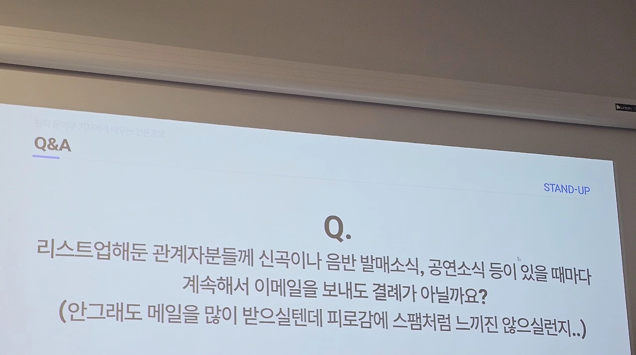 보도자료 보내기 가장 좋은 시기로는 연휴 직전이나 2-3월을 말씀해 주셔서 그 점도 기억해 뒀다. 왜냐하면, 강연을 들으며 나도 기자님들에게 내 인터뷰를 실어주면 안 되냐고 요청하고 싶다는 생각이 좀 들었다. 그동안은 싱글 발매, 책 출간만 보도자료를 돌려왔는데, 나도 인터뷰 기사가 있고 싶었다. 아무리 무명이어도, 무명 아티스트 발굴에 관심 있는 기자 분들도 계실 것 아닌가. 게다가 내년은 나의 데뷔 10주년이다.