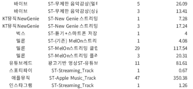 음원 수익은 앨범을 발매한 각 유통사를 통해 받는다. 아래는 한 곡의 한 달 음원 수익 일부다. 1회 스트리밍당 평균 3-4원 정도 받은 것을 알 수 있다. 전 세계 모든 플랫폼 합쳐서 사람들이 내 노래를 10만 번 재생했다고 가정했을 때, 30-40만 원이다.
