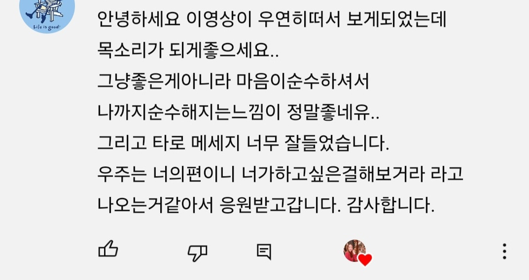 2015년부터 유튜브를 했지만, 10년 만에 다른 채널로 대박이 났다. 기존 채널은 올해 내내 엄마 친구분을 제외하고는 댓글이 거의 없었다. 그런데 타로 채널은 자고 일어나면 확인할 댓글이 10개 이상이다.