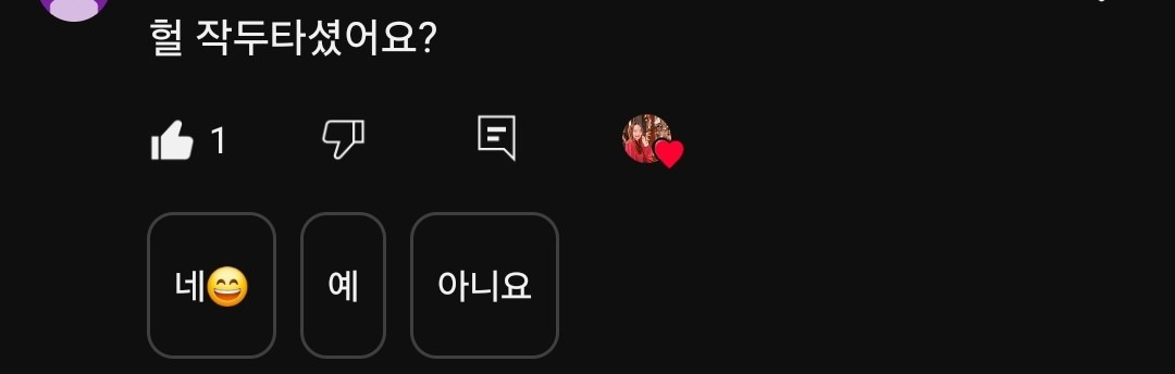 작두 타셨어요?가 예, 아니요로 답할 댓글이 아니잖아. 역시 이것이 AI의 한계인가. 유튜브가 저렇게 종종 답글 추천해 주는 것도 처음 알았다.