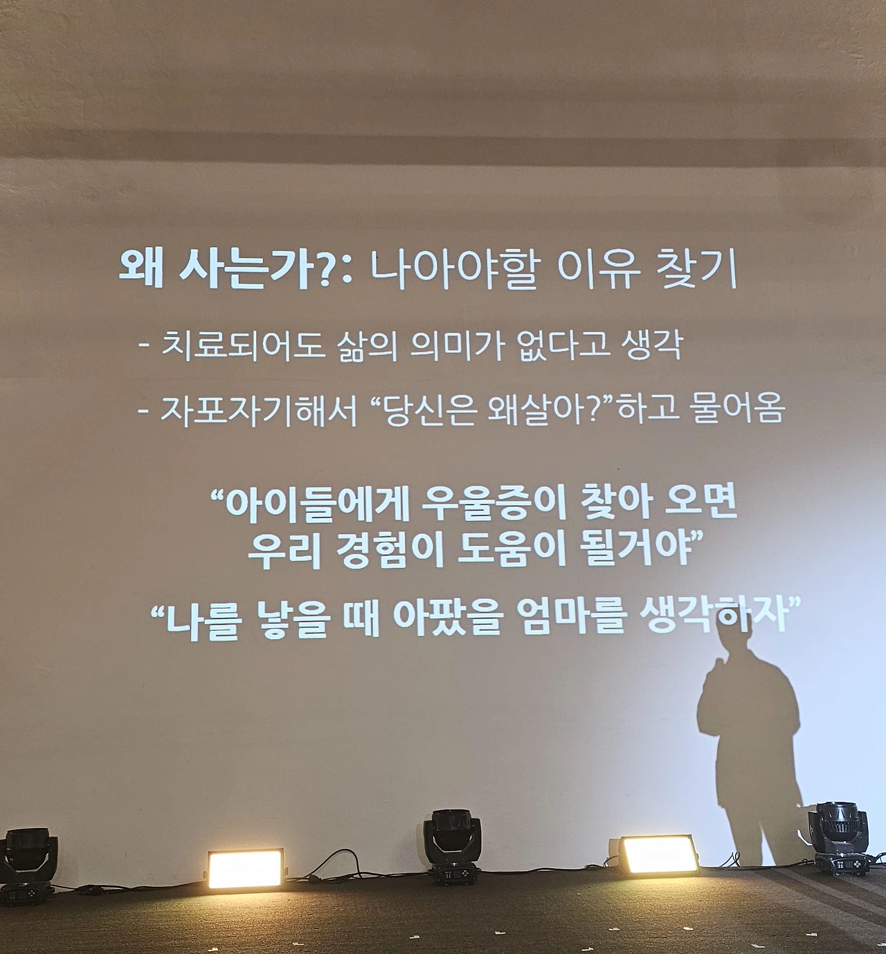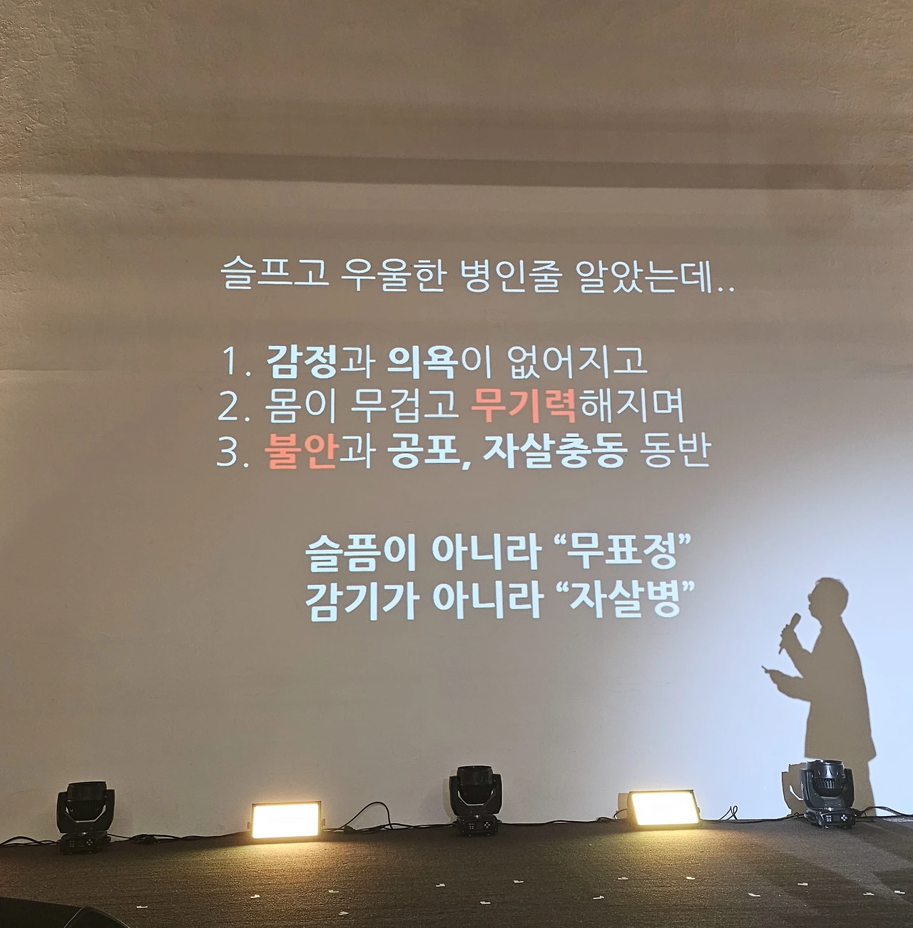 간식을 먹고 기분이 좋아진 상태에서, 오프닝 스피치를 들었다. 오프팅은 우울증 환자였던 와이프를 두신 작가님의 이야기였다. 작가님도 우울증에 대해서 너무 몰라서, 초기 대응을 놓쳤다고 말씀하셨는데 정말 와닿았다. 어떤 질병이든 다 그렇지만, 우울증도 초기 대응이 너무 중요하다. 아무리 강조해도 모자라다.
