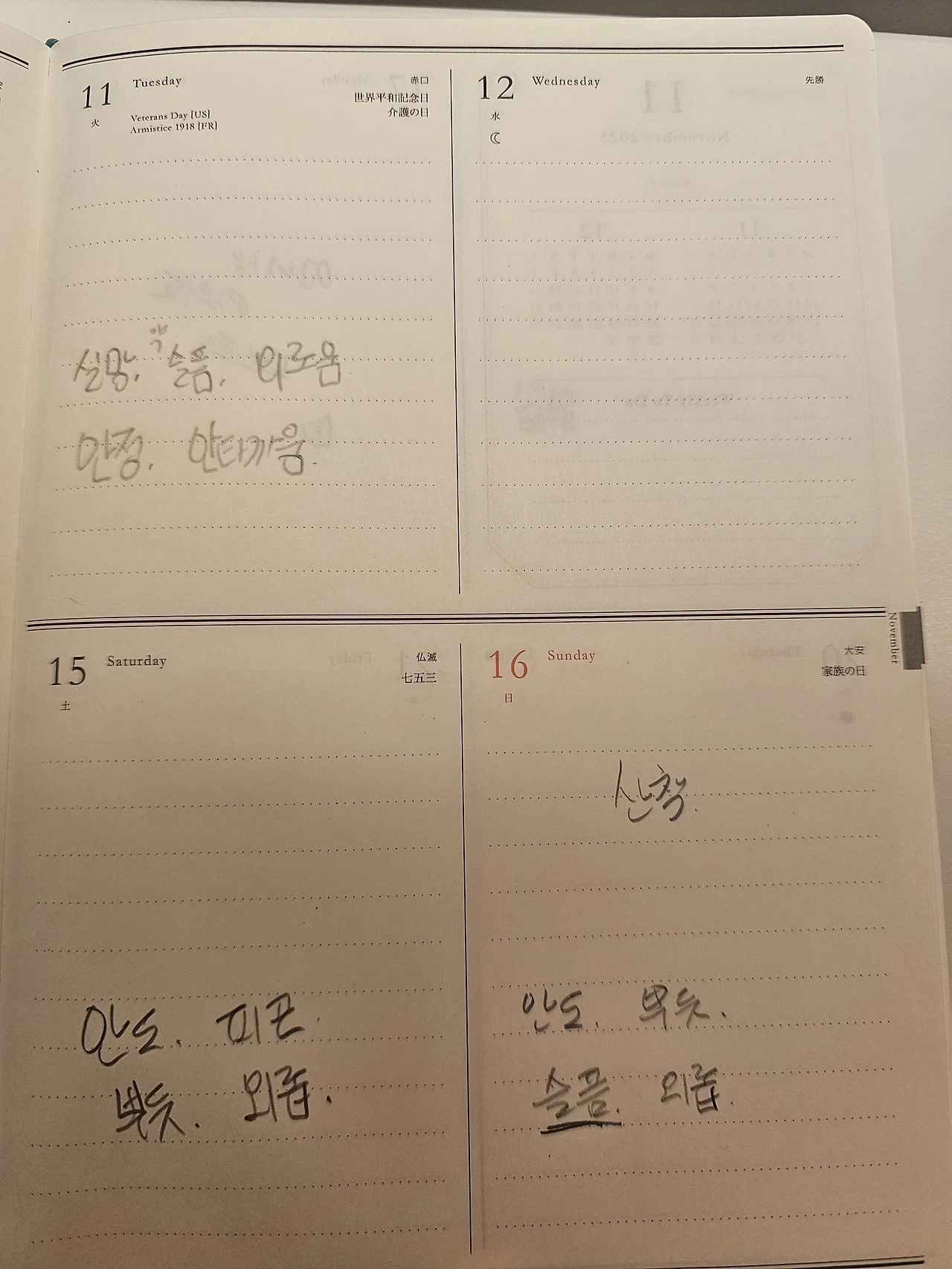 올해 노션을 통해 '감정 클릭하기'를 했다. 하루에 2-3번씩, 느끼는 감정을 클릭했다. 하지만 선택할 수 있는 감정이 8가지라 한계가 있었다. (수정하고 싶었는데, 노션 사용법이 내게 어렵다.) 그래서 그냥 노트에 수기로 적기로 했다. 아니나 다를까, 요며칠 '슬픔, 외로움'이라는 키워드가 계속 등장했다. 이 노트가 아니었으면 몰랐다.