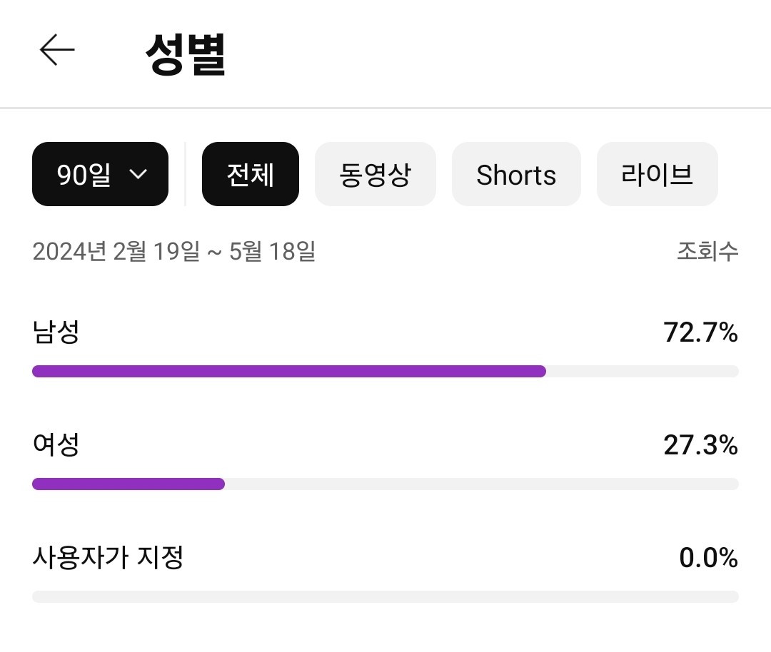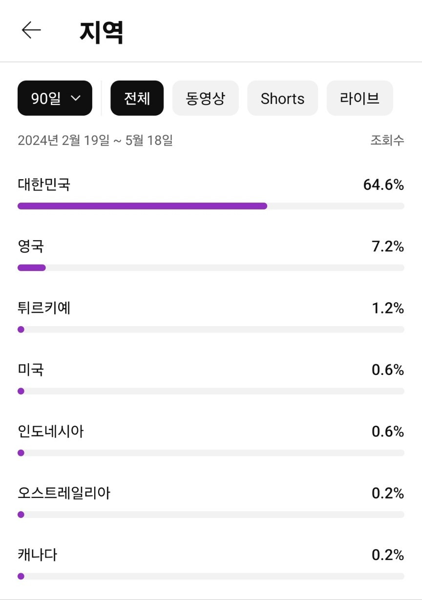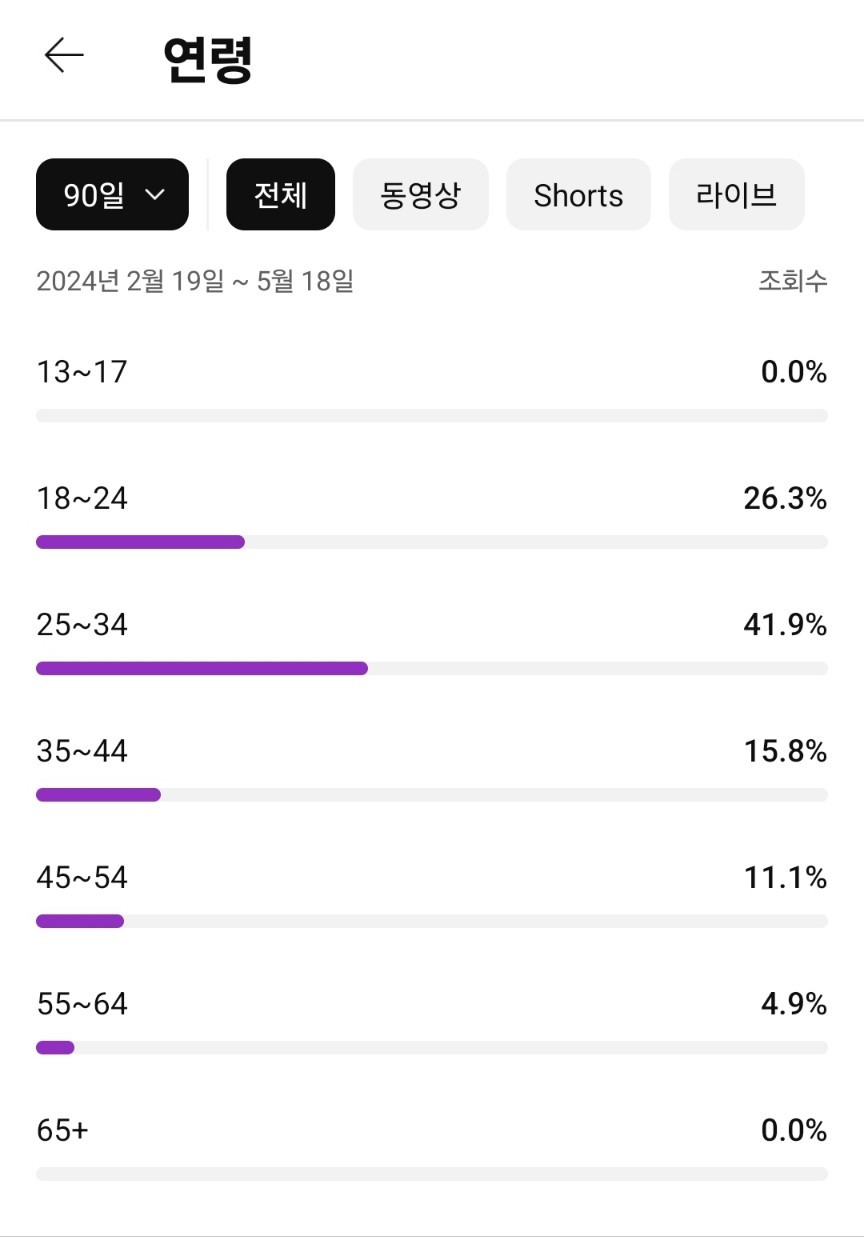 첫째로, 유튜브 스튜디오를보면 시청자층을 확인할 수 있다. 최근 7일, 28일, 90일, 365일, 전체 기간 등 설정해서 확인할 수 있는데 최신이면서도 많은 데이터를 위해 90일로 지정해서 확인했다.