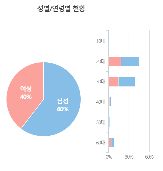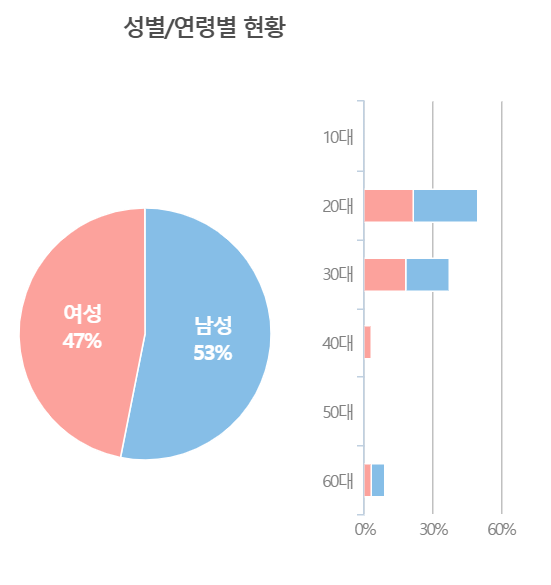 가장 의아했던 부분은 성별이었는데 남자 72%, 여자 27%면 상당히 참고할 만한 차이다. 최근 1년을 봤을 때남자 58%, 여자 41% 정도 차이였는데 왜 근래 더욱 이렇게 차이가 나게 되었는지 궁금해졌다.