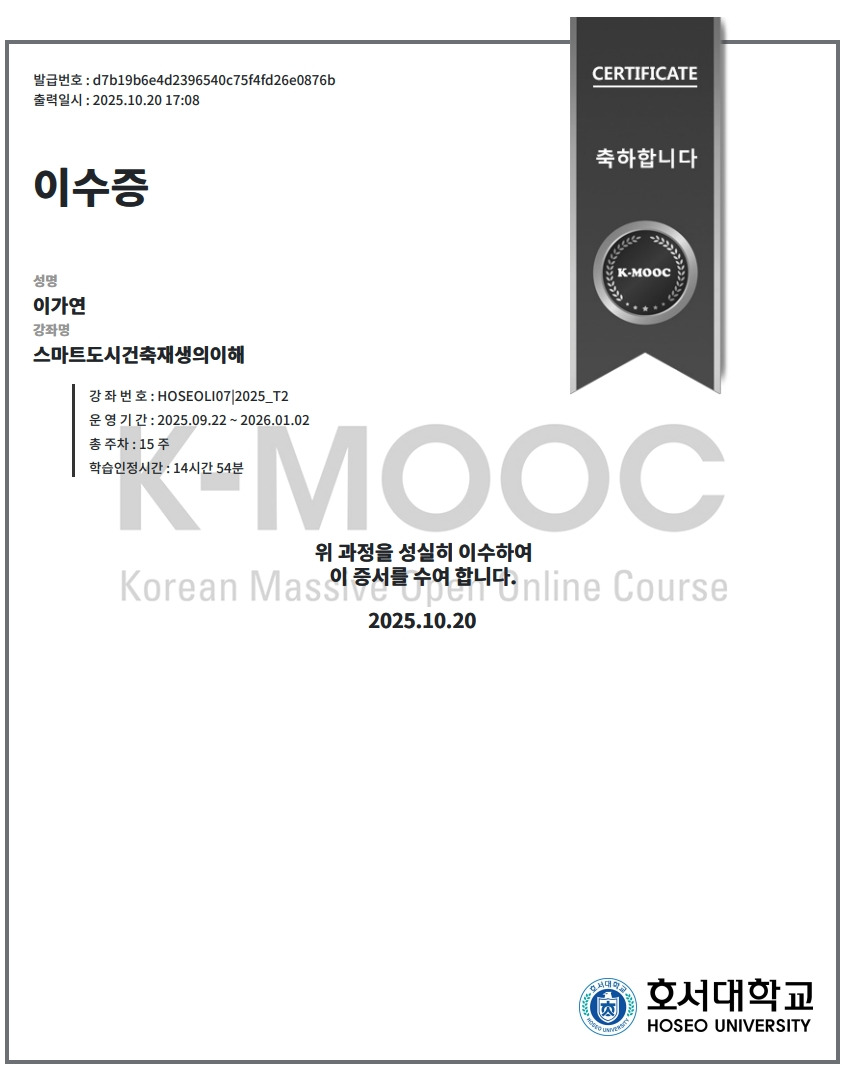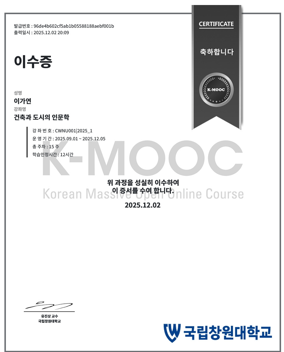 올해 얻은 K-MOOC 이수증이 왜 둘 다 건축인지 나는 진~~짜 모르겠지만 이 글이 어느 매거진에 속해있는지 보고 알아서 유추하시라. '좋은 건축이 뭔지 내가 왜 알아야 되는데...' 하면서도 재미있었다. 좋은 노래가 뭔지도 아직 모르겠는데.