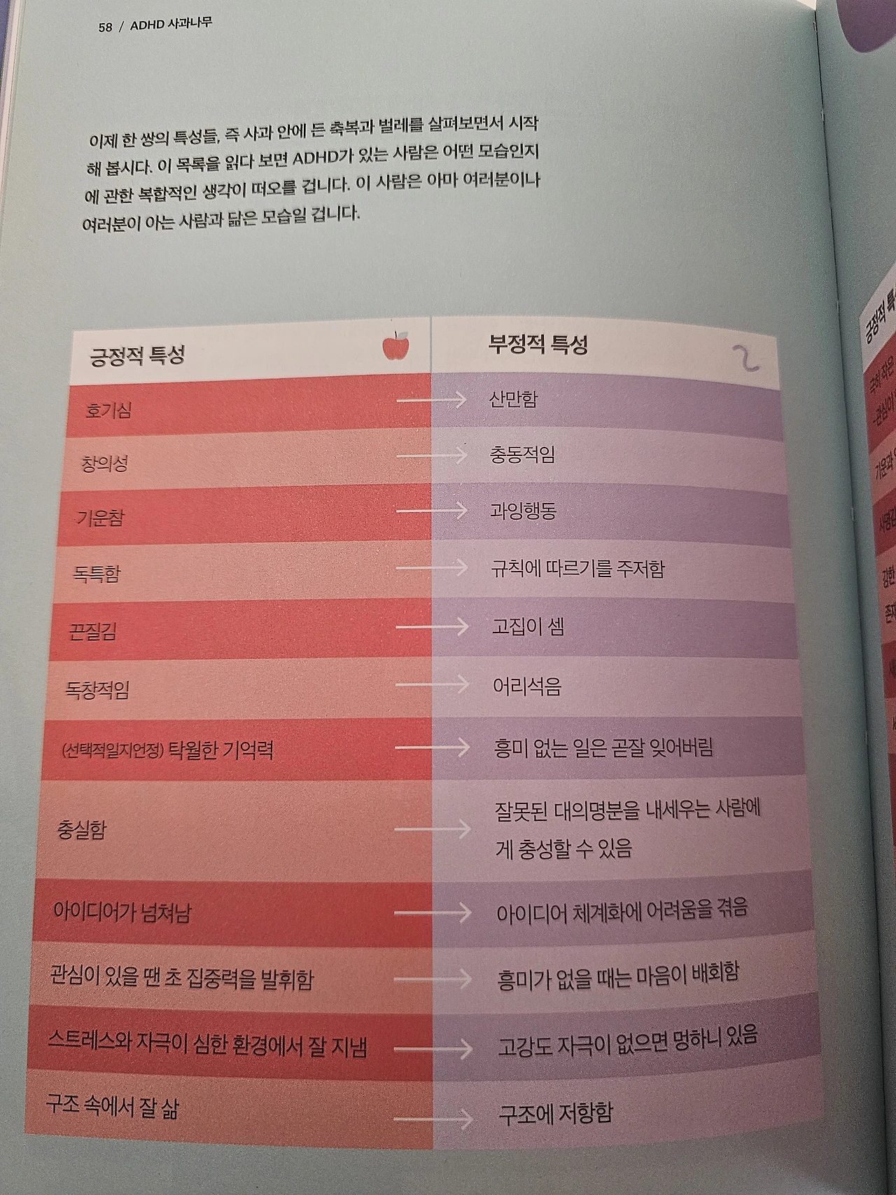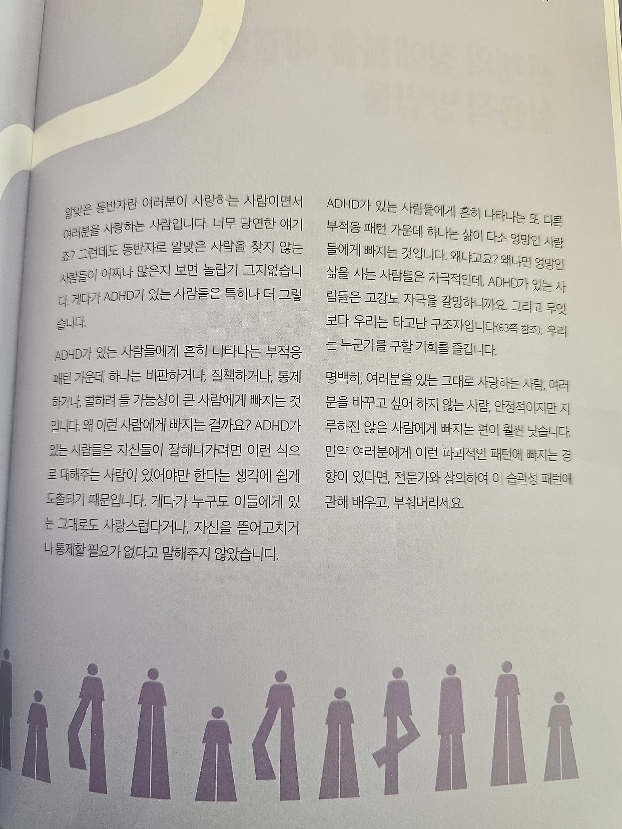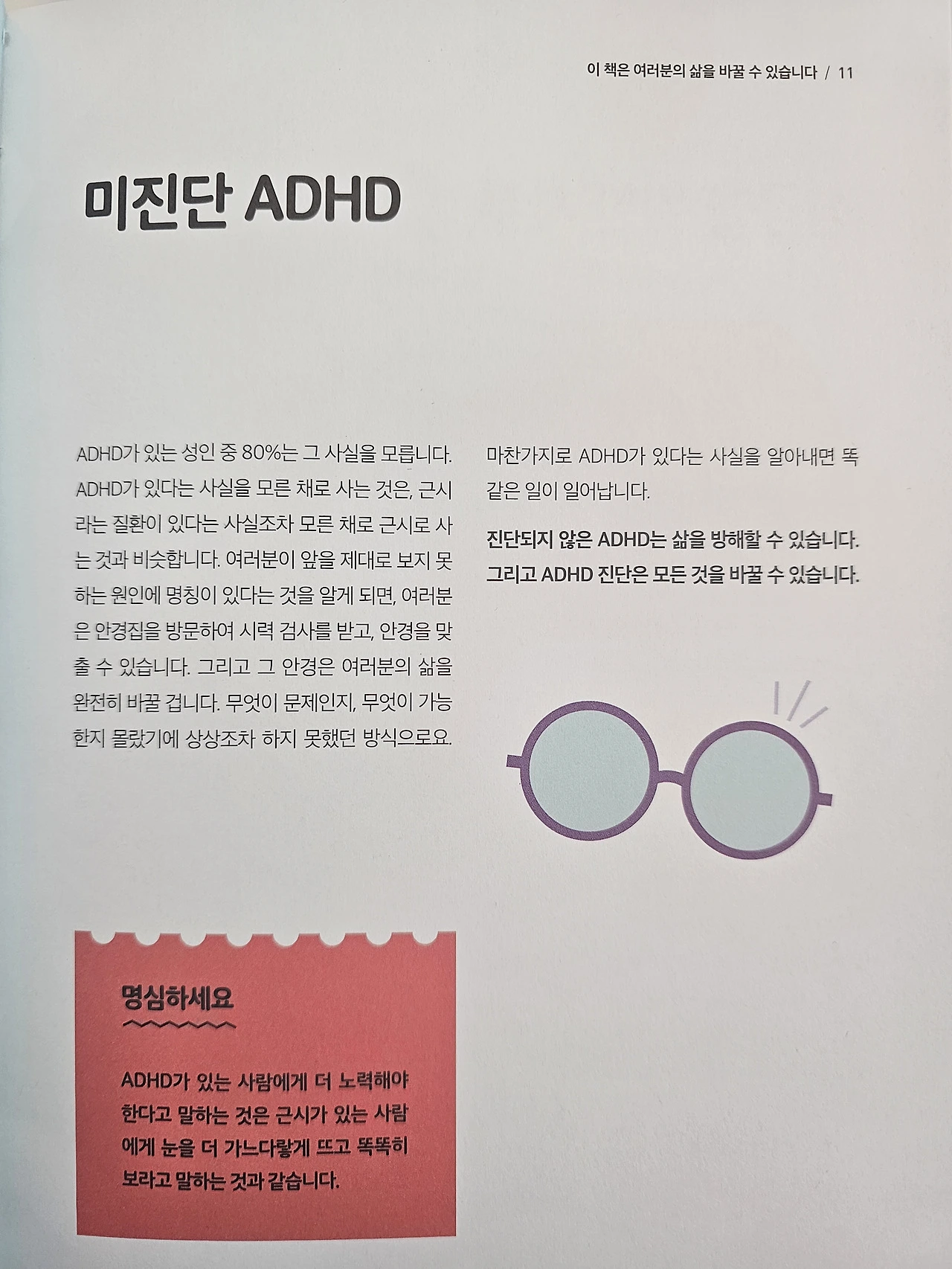 이 책에 따르면 ADHD 유병률이 5%라 해도, 임상적으로 유의미한 비율은 25%나 된다고 한다. 4명 중 1명 꼴이다. 그렇기 때문에 가족, 친구, 애인, 주변 사람들, 그리고 나 자신을 이해하기 위해서 이 책이 꼭 필요하다.