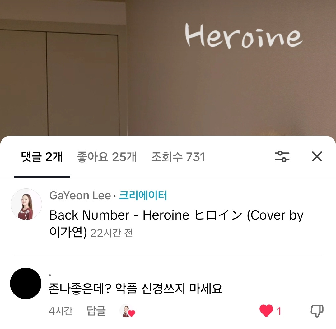 그게 제일 심했고, 다른 댓글은 별로, 느끼하다고 했고, 또 다른 댓글은 친구를 소환하더니 그 친구가 와서는 이모티콘으로 X 표시가 되어 있었다. 한 영상에 싫다는 댓글만 세 개 달린 것도 처음 봤다. 유튜브는 조회수 천이 넘어야, 악플이 한 개 있을 정도의 비율이거늘 이 영상은 700회 정도밖에 되지도 않았다. 조회수가 이렇게 없는데 당황스러웠다. 틱톡은 시청 연령층이 훨씬 더 어리단 걸 알기 때문에, 댓글을 아예 안 본다. 네 녀석 때문에 다 봐버렸잖아...