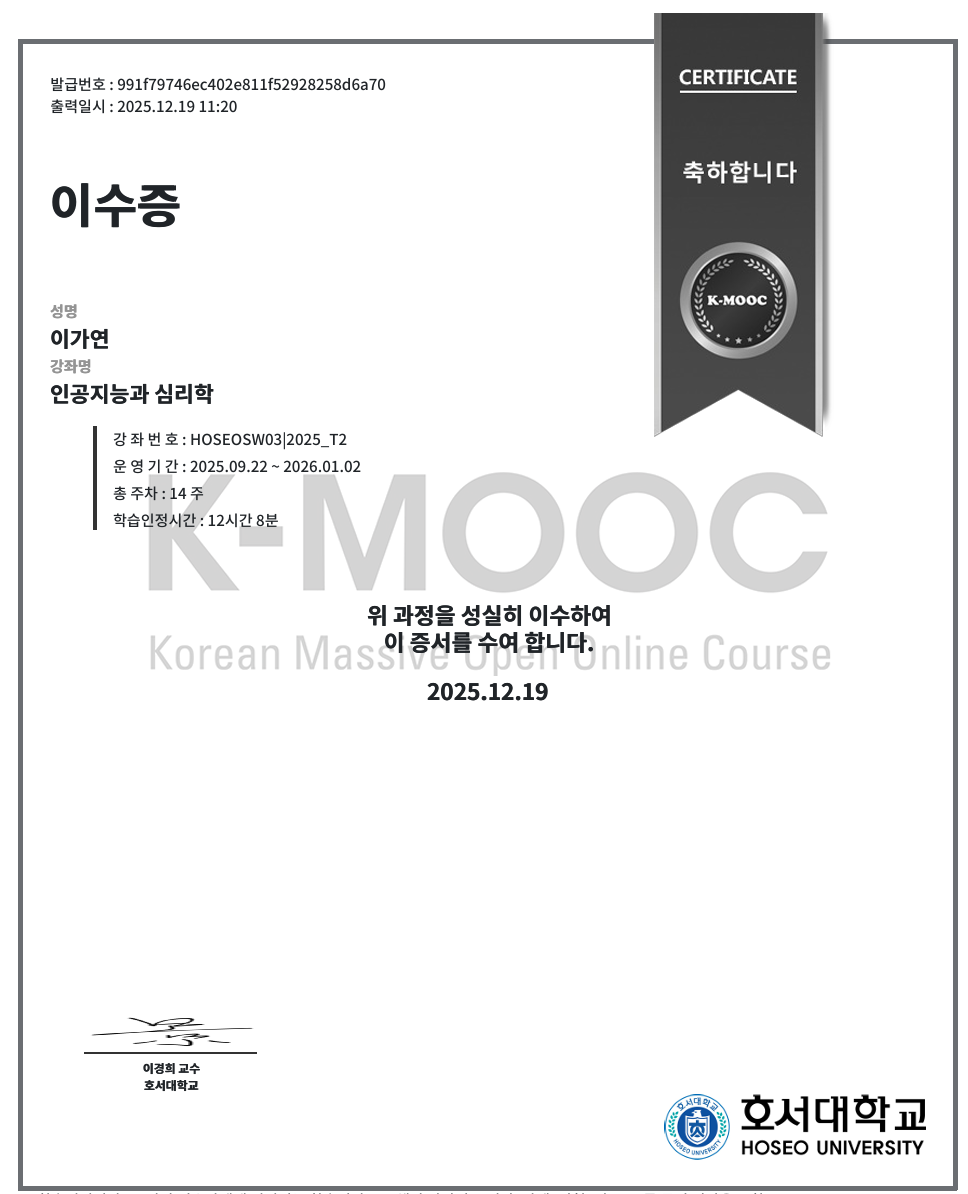 올해 마지막 K-MOOC 이수증이다.