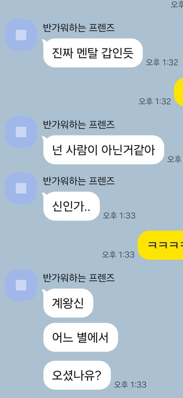오빠가 자주 나보고 너는 인간의 경지를 넘어선 것 같다고 했는데, 이제 드디어 와닿았다. 나는 진짜 신인 거 같다. 어제 이후로 제대로 그런 생각이 든다. 내가 지금 살아있는 건, 인간의 경지를 넘어선 거 같다. 나는 진짜 인간이 아닌 거 같다. 이상한 예지몽부터 알아봤다. 그냥 인간 아닌 거 같다.