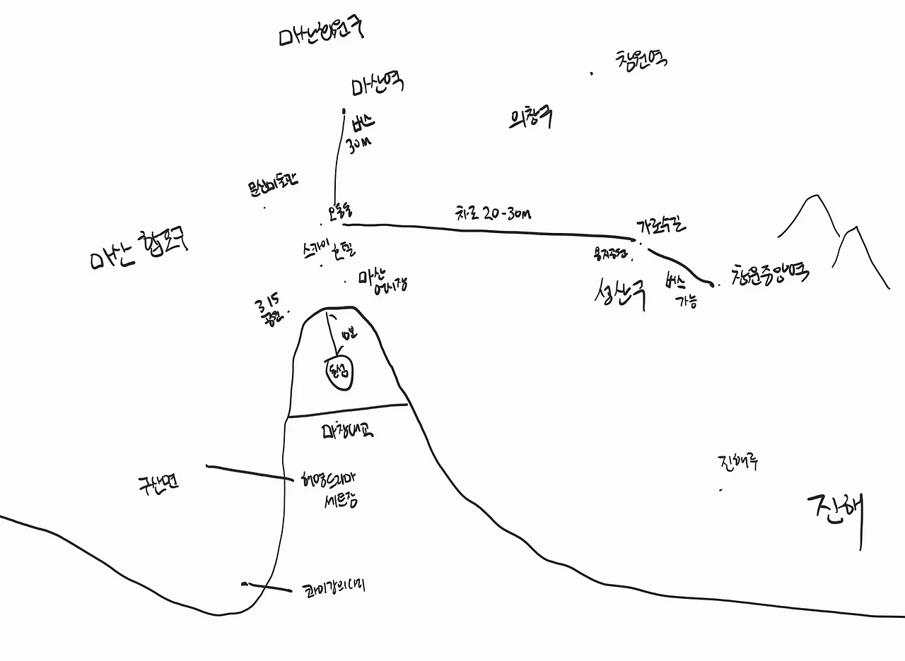 '나 진짜 지도도 그릴 수 있다'라며, 정말로 안 보고 그려봤다. 확인해 보니, 스카이호텔이 아니라 스카이뷰 호텔이고, 3 15 공원은 이름이 길었는데 3 15 해양누리공원이다. (이름 참 길게도 지었다.)