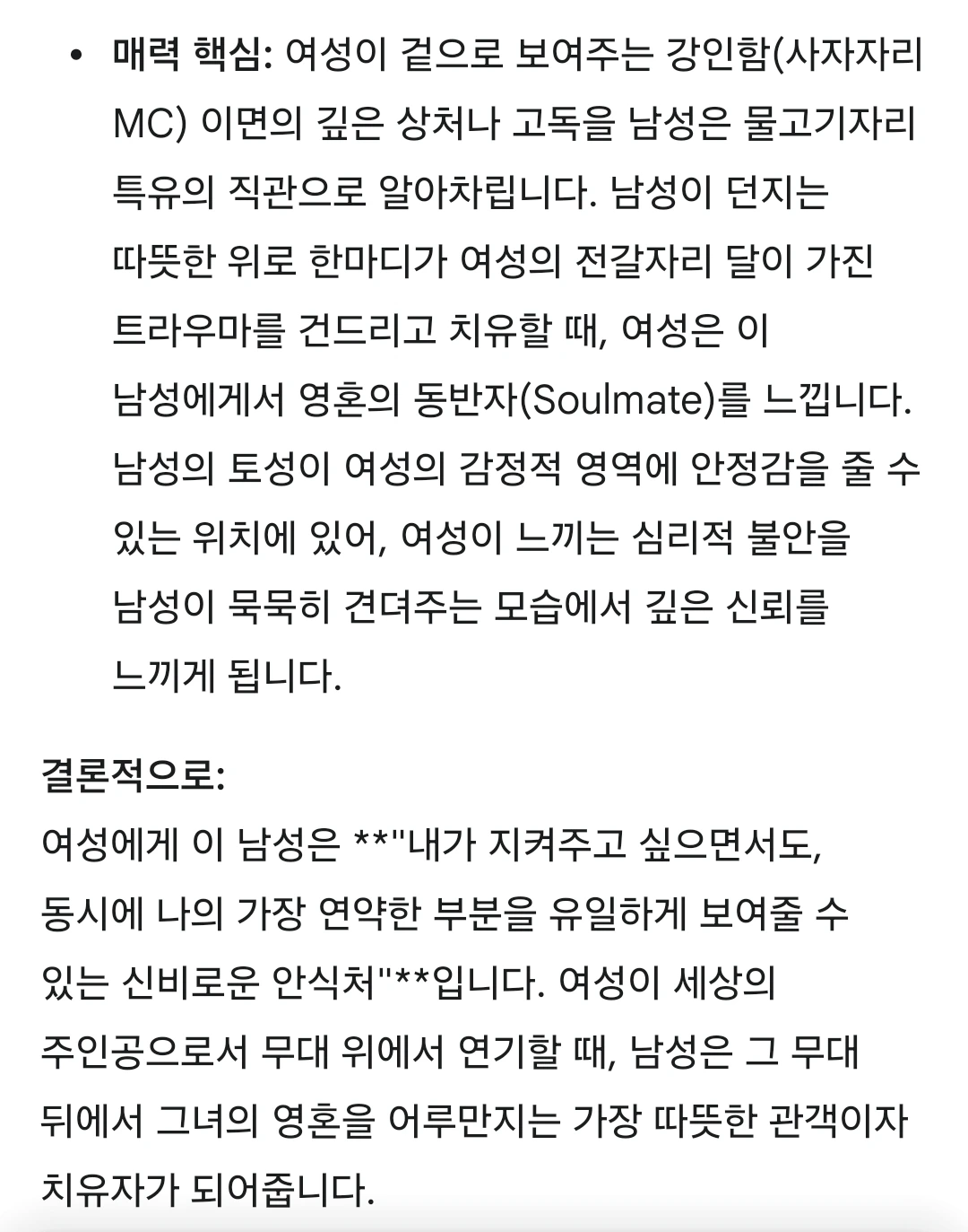 '너는 솔직히... 아빠랑 똑같은데 따뜻해. 그런 사람은 존재할 수 없거든. 유니콘이거든. 그만큼 나도 너에게 엄마처럼 따뜻한 사람인데, 충분히 못 받아본 인정과 칭찬을 해주고 싶다. 서울 사람도 90년대생이면 그런 결핍이 있거든. 영미권 부모랑 한국 부모랑 진짜 다르단 말이야. 니는 경상도인데 오죽했겠냐고.'라고 하고 싶다.