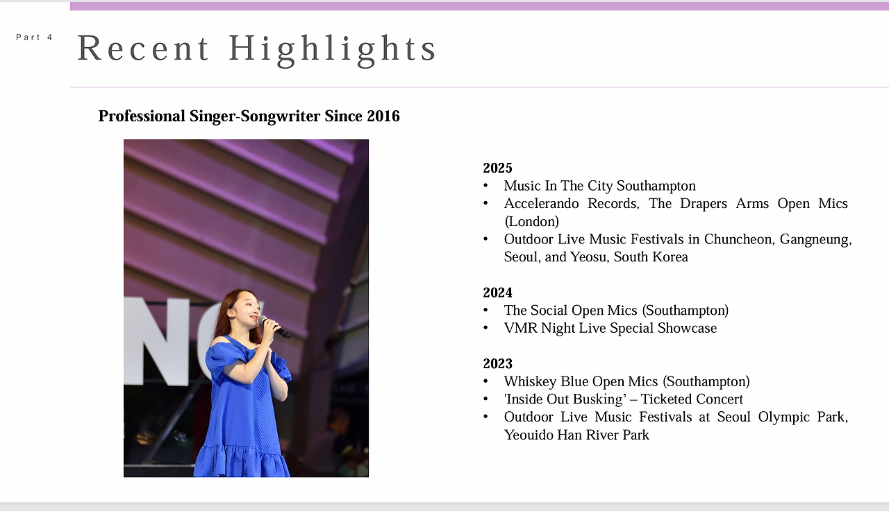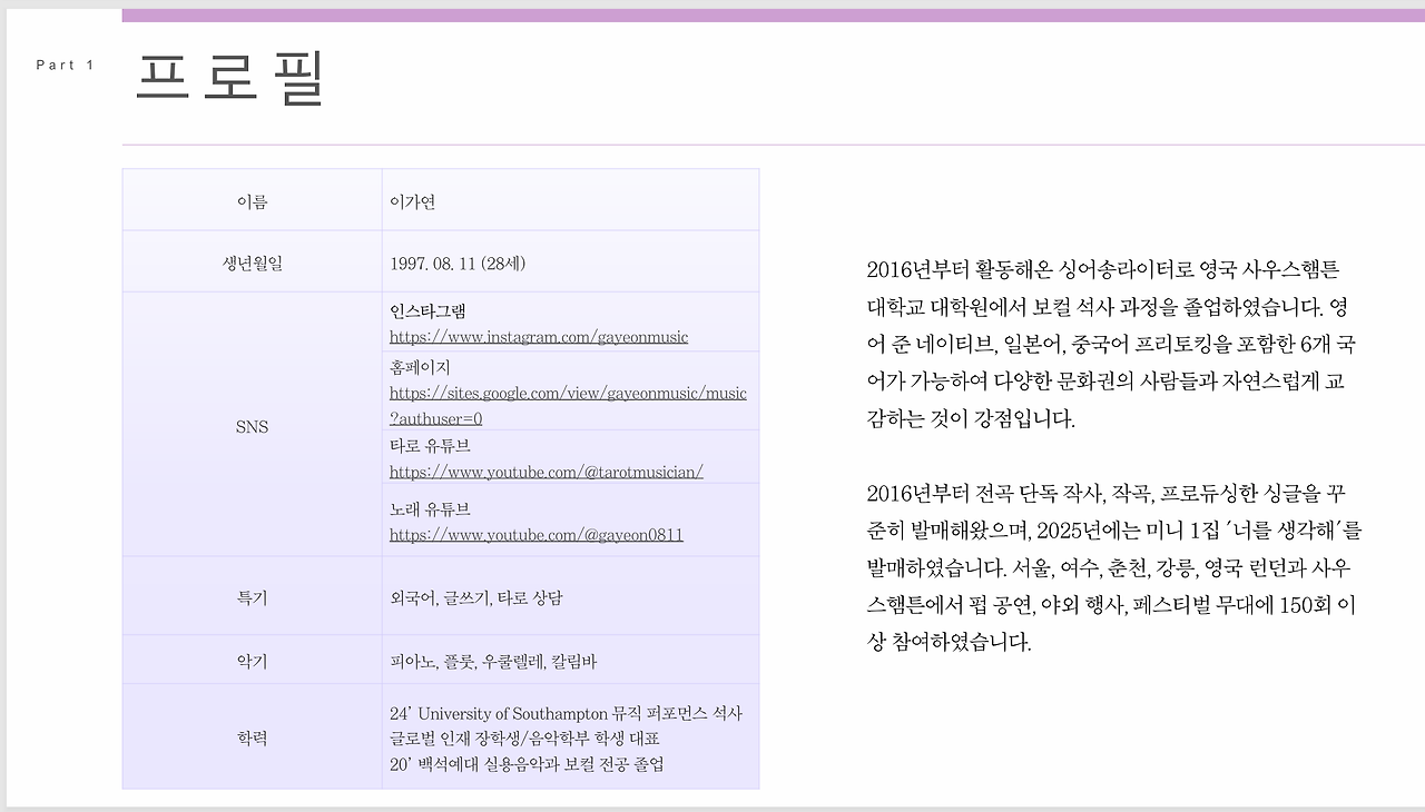먼저 지금까지 페스티벌에 뿌리고 있던 PPT 슬라이드를 공유했다. 이 사람들이 얼마나 바쁜 사람들인데, 첫 장 임팩트가 부족하다는 말을 들었다. '무슨 음악을 하는지는 세 번째 슬라이드에 나와 있는데' 싶지만, 애초에 세 번째 슬라이드까지 안 볼 수도 있다. 내가 만든 첫 장은 다소 딱딱하고 이력서 같았다는 걸 깨달았다. 아래는 한국어 버전이다.