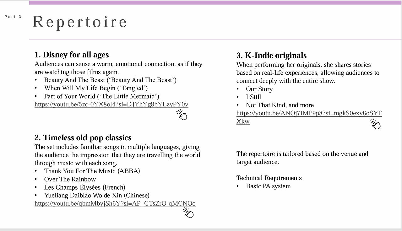 저기 손가락 클릭 표시가 있게 된 데에도 이유가 있다. 영국에 갈 때마다 만나는 음악학부 교수 한 분이 계신데, 최근에 이 슬라이드를 보내드린 적이 있었다. "너 노래 링크는 없어?" 하시길래, '엥... 링크 다 적혀있는데..' 싶었다. 그래서 링크가 더 잘 보이도록 클릭 표시를 넣었다...