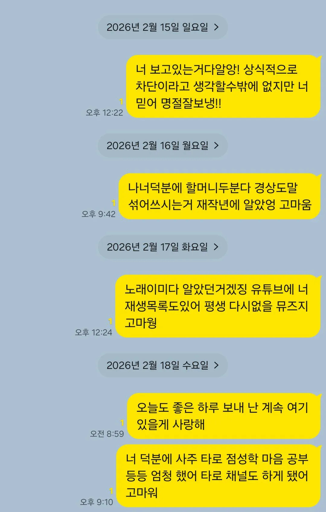 브런치 글 하나를 쓰더라도, 유튜브 영상 하나를 올리더라도 그 사람이 어떻게 생각할까 생각했다. 하도 올리는 양이 많아서, 전부 다는 아니더라도 보고 있을 거라고 믿었다. 작년 초부터 그런 믿음으로 글을 써왔다.. 내 모든 행동 뒤엔 한 사람에 대한 마음이 있었다. 브런치, 유튜브 조회수, 유튜브 라이브 시청자수 하나하나에 그 사람이 숨어 있을 거라 믿었다. 매일 그렇게 살았다.