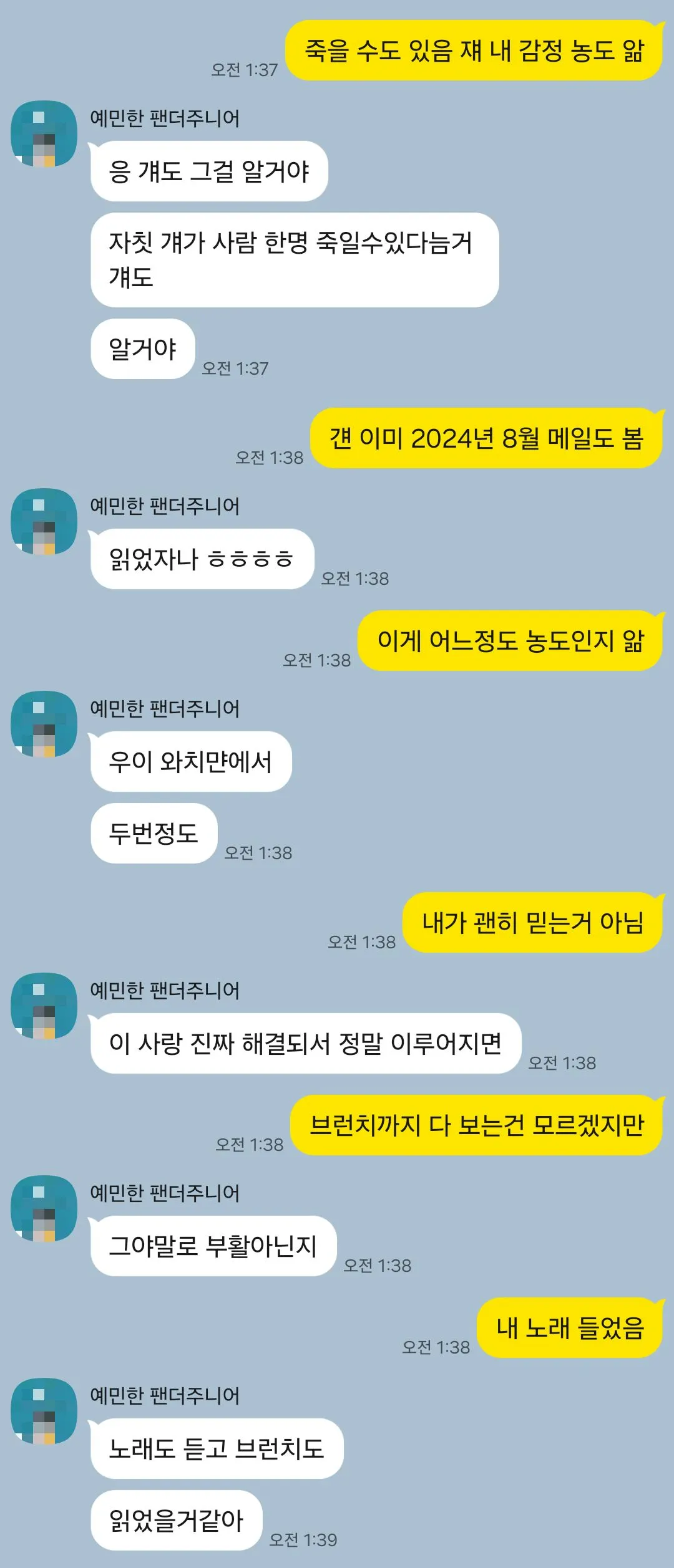 난 그러지 않았다. 믿음이 너무 깊었다. 그게 그 사람에 대한 믿음이든, 내 영적인 능력에 대한 믿음이든, 다 보고 있는데 이유는 모르겠지만 안 읽고 있다고 믿었다. 그렇게 믿은 것에 대한 후회는 없다. 충격과 슬픔만 있을 뿐.