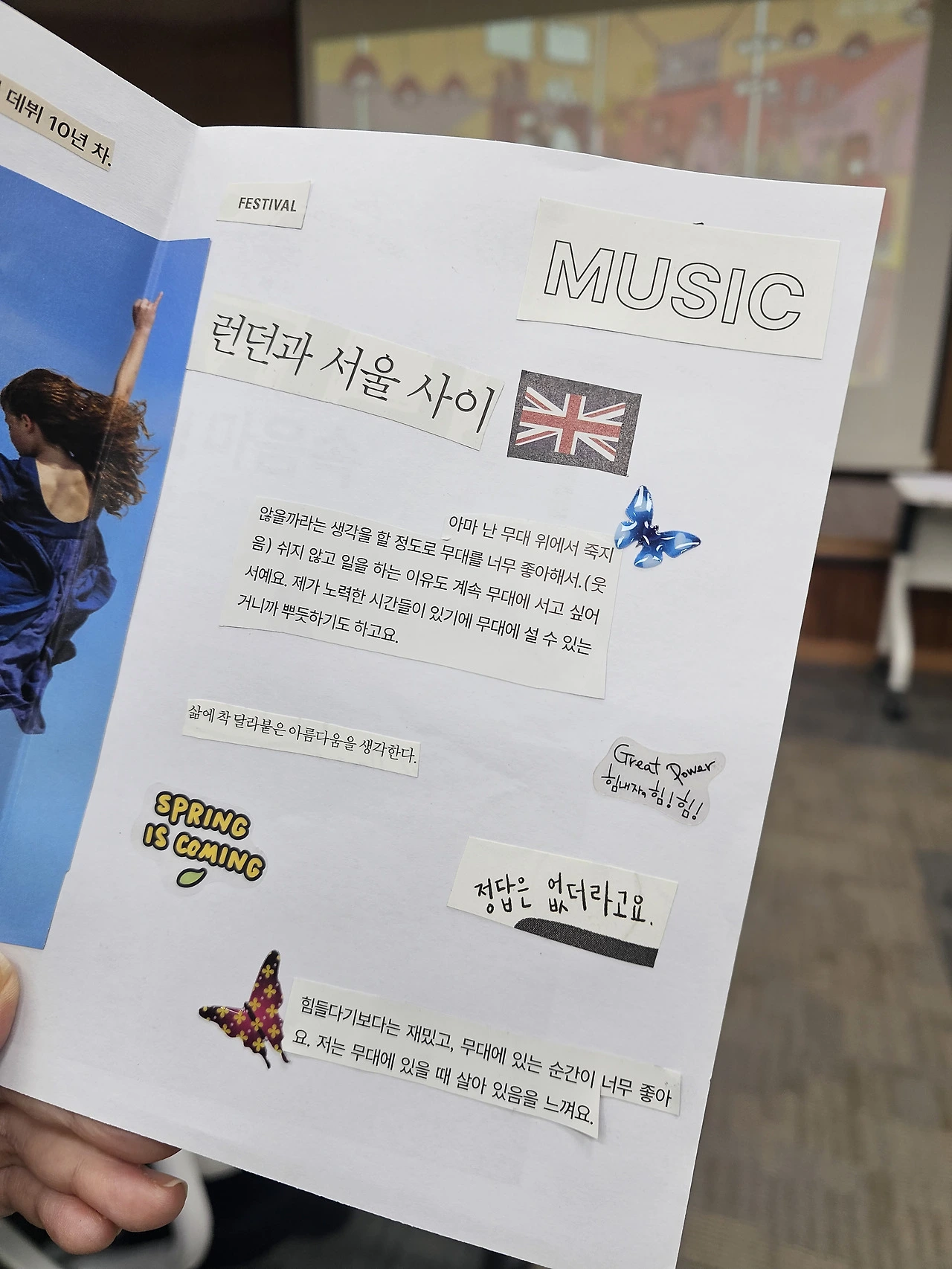 지난번 ZINE 만들기에서 얻은 팁이 있다. 축구 매거진을 보면 영국 국기를 찾을 수 있다. 마침 '런던과 서울 사이'라는 글귀가 있어 반가웠다. 나의 마음은 런던과 서울 사이를 노상 오간다.