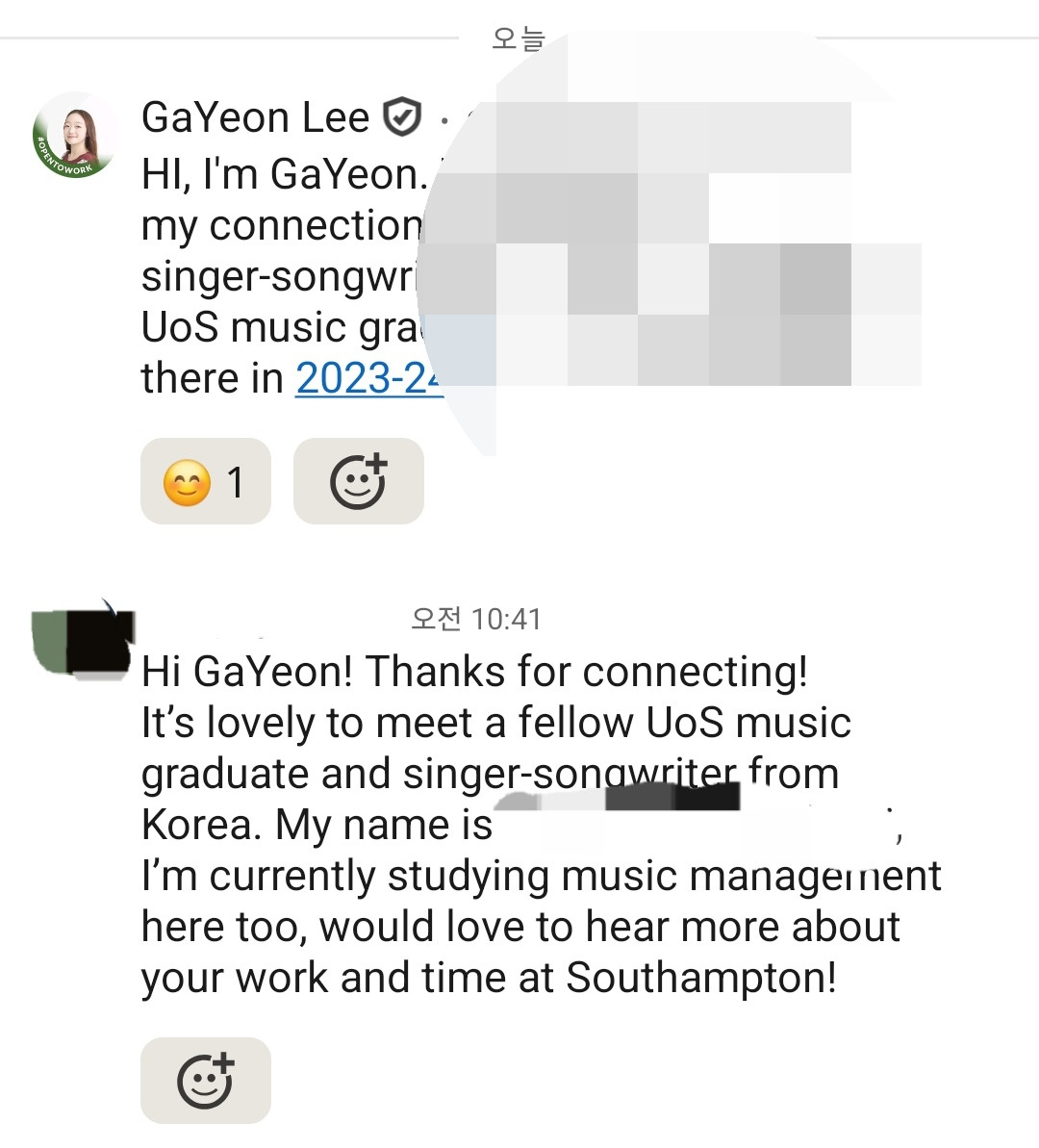 해석 : 안녕. 친구 신청 고마워. 나도 우리 학교 음악 졸업생이자 한국 싱어송라이터를 알게 되어 반가워. 내 이름은 ~야. 나는 지금 뮤직 매니지먼트 전공 하고 있고, 너의 사우스햄튼에서 보낸 얘기도 더 듣고 싶네.