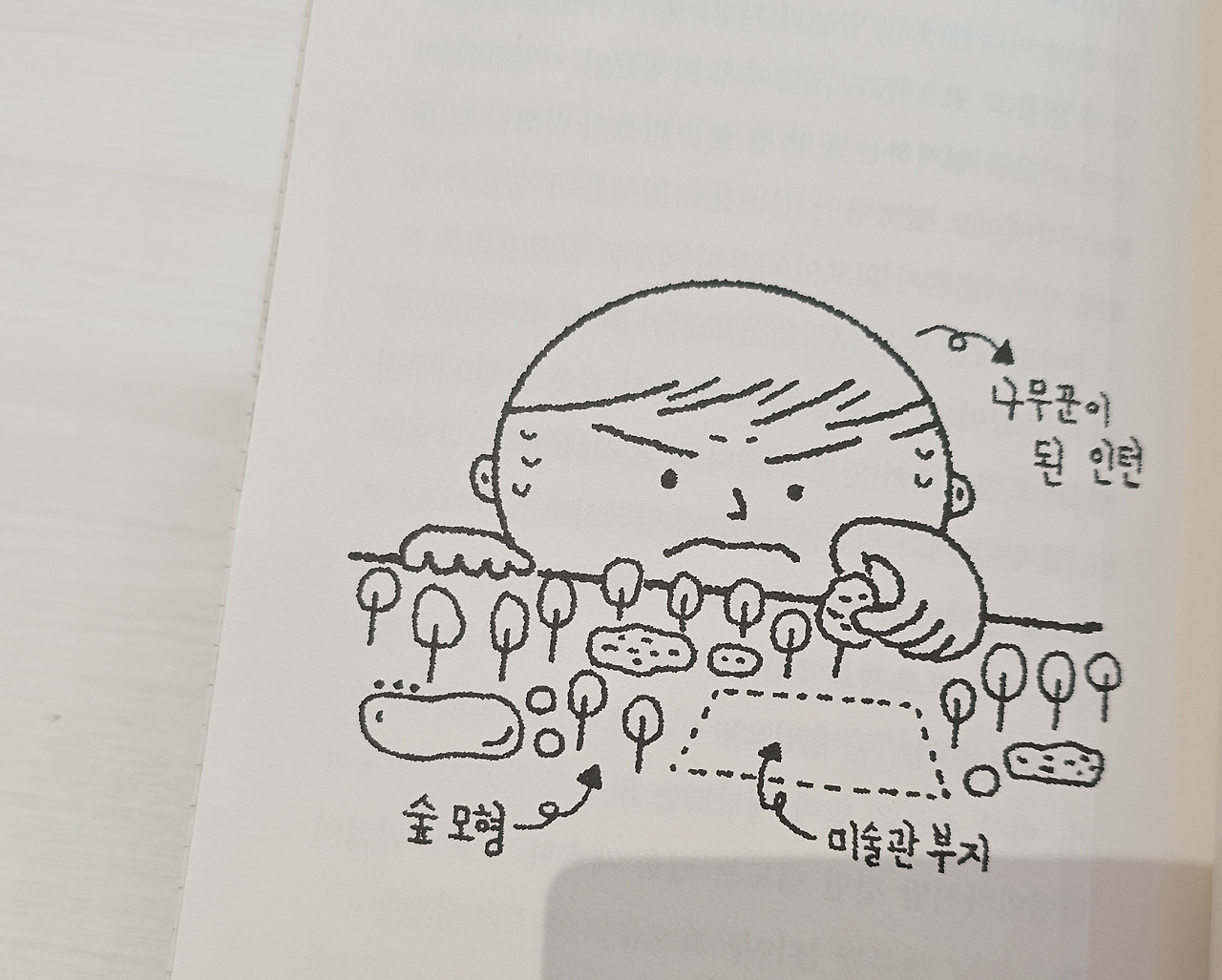 p163 일주일 동안 나무 천 그루를 만든 다음, 일기장에 '나무꾼이 된 것 같다'라고 썼어요. 위층에서 직원들이 치열하게 미술관 건물을 설계하는 동안 전 숲을 만들기 바빴어요. (중략) 어느 날은 나무 모형들을 보다가 꼭 제 처지 같단 생각이 들었어요. (중략) 인턴 기간 동안 건축을 향한 제 열정은 차갑게 식어 버린 (중략)