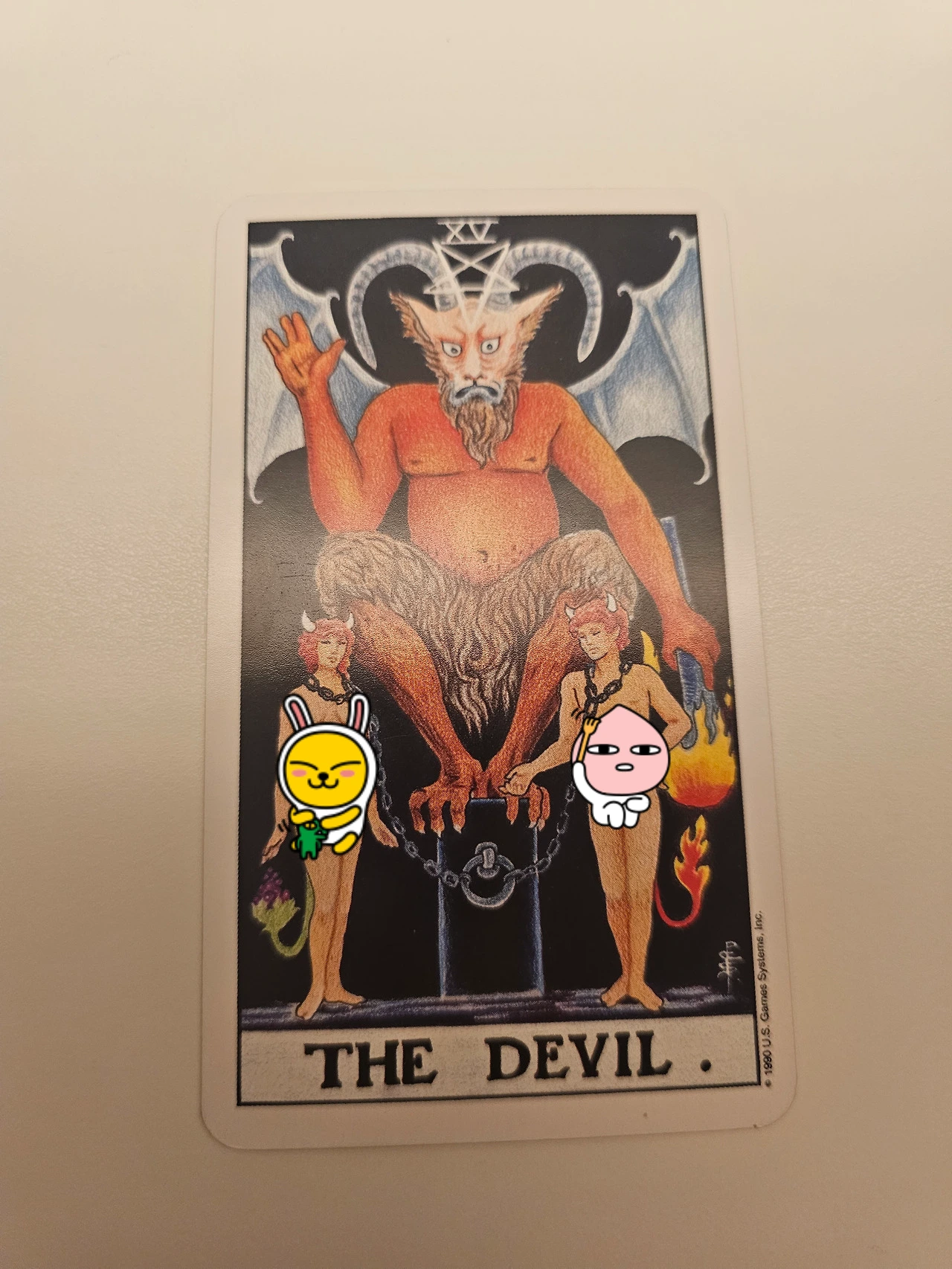 '이 사람이 어디를 수술했는지 맞춰라' 문제도 '이게 타로로 나올까..' 싶었는데요. 아래 카드가 나와서 힌트를 얻었습니다. 목줄로 목이 묶여있기 때문에 목을 추리할 수 있었고, 이 카드는 원래 술, 담배 같은 중독과 쾌락을 상징하기 때문에 '술 많이 마셔서 간이 안 좋았나...' 생각했어요. 정답은 목은 맞았고, 다른 하나는 비만으로 위 절제술이었습니다. 저는 위 절제술이란 걸 잘 접해보지 않아서 생각도 못 한 거죠. (저는 타로로 건강운은 안 봅니다. 건강은 걱정 되면 그냥 바로 병원 가야한다고 생각해요.)