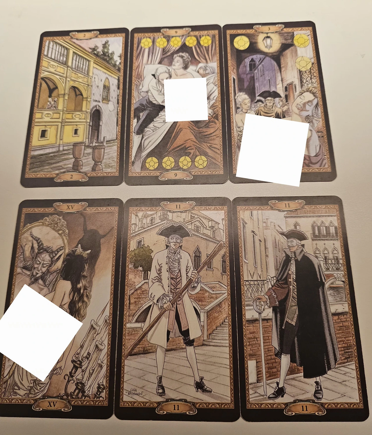 아래가 바로 속마음을 볼 수 있는 카드입니다. 연애 덱인만큼 노출이 있어서 가렸어요. 위는 남자, 아래는 여자 속마음으로 뽑아보았는데요. 보통 타로를 보러 오시는 분들은, 여자 분들이 많습니다. 무책임한 남자, 우유부단한 남자 등 남자가 뭔가 좀.. 부족한 케이스를 많이 봤죠. 그런데 이 배열을 펼치고는 '남자가 상처 받았겠는데...' 싶었습니다.
