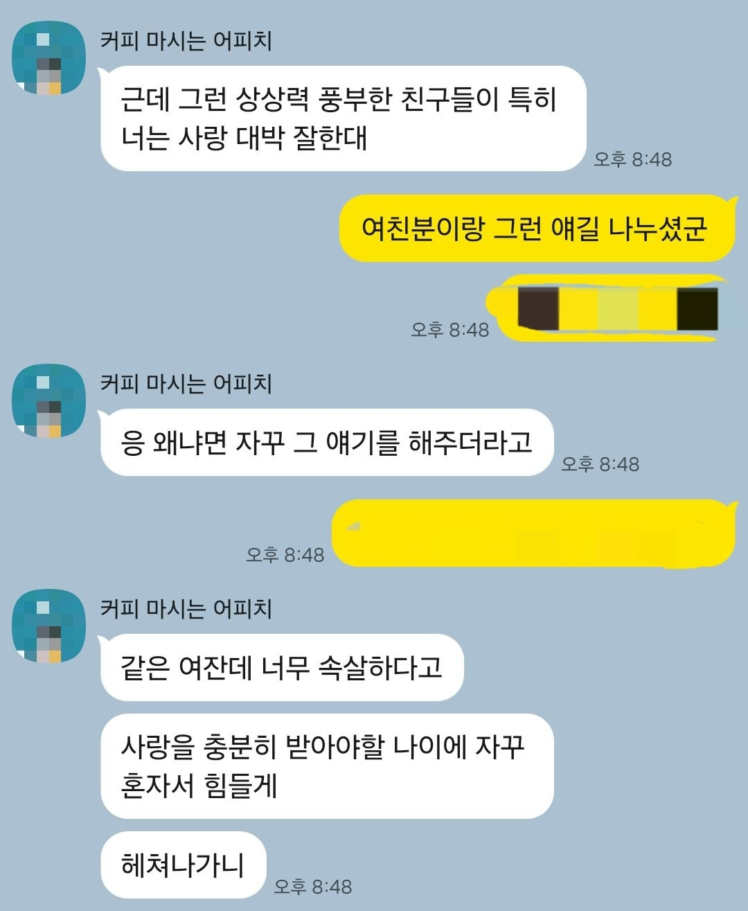 '맺어지고 싶은 이유 중 하나가... 그를 통해서 나의 가정사를 치유 받고 싶어하는 건 아닌가' 하는 생각이 작년부터 들었다. 너무 부끄럽지만 그래서 '부모에 대한 결핍이 있어라 제발... 경상도잖아. 따뜻함 못 느꼈어라 제발.' 하기도 하였다. 결핍과 결핍이 만나야 떨어질 수 없기 때문이다. 나만 결핍이 있으면 나를 찾을 이유가 없다. 그런데 나는 정말 따뜻한 사람이고, 그걸 표현하는 능력이 특출난 거 같다. 즉각적이고, 예술적이고, 깊이 있다. 그러니 '경상도잖아. 그런 표현 못 받아봤어라 제발'하는 건 당연하다... (이 내용은 작년 이 맘 때도 썼다.)