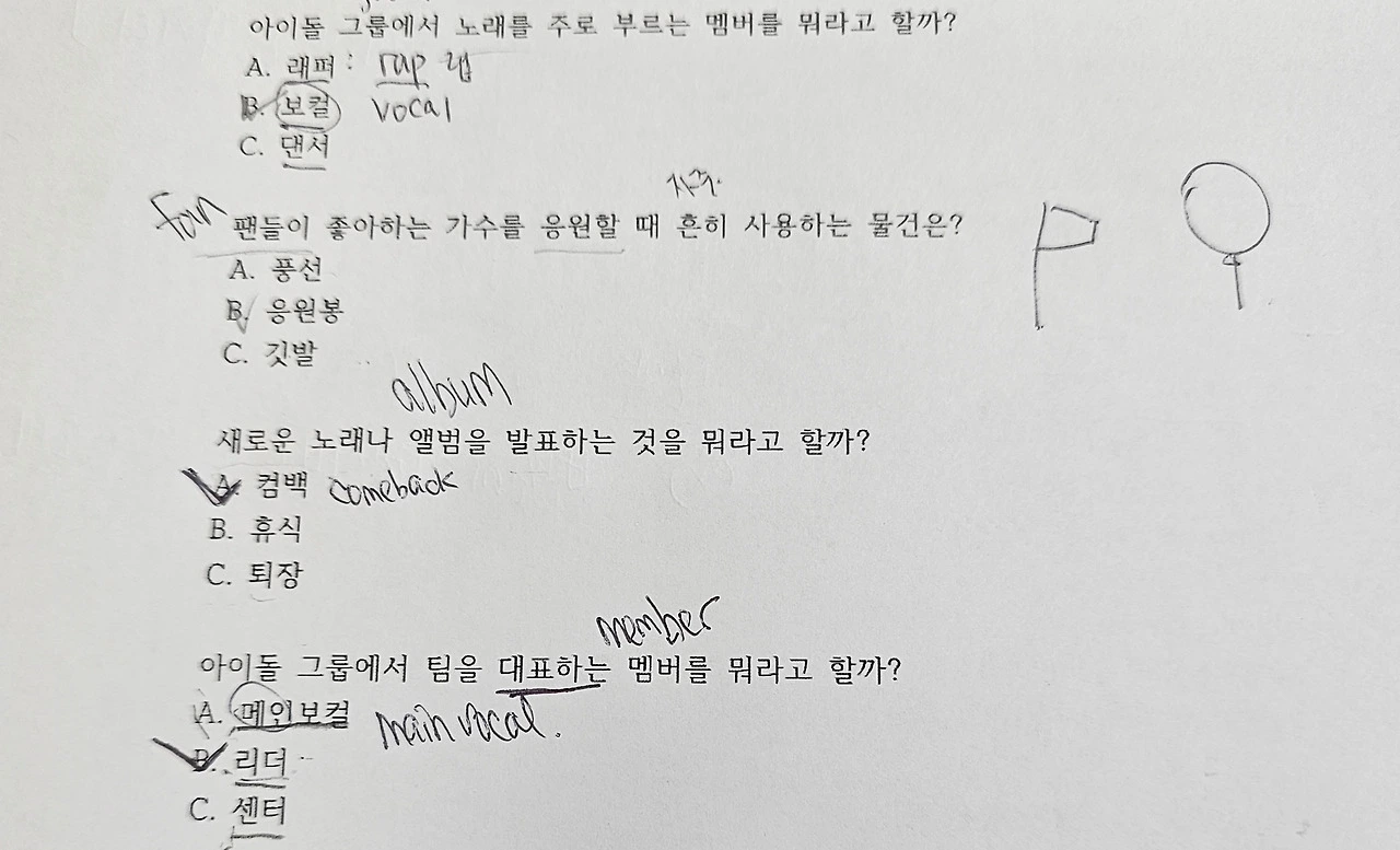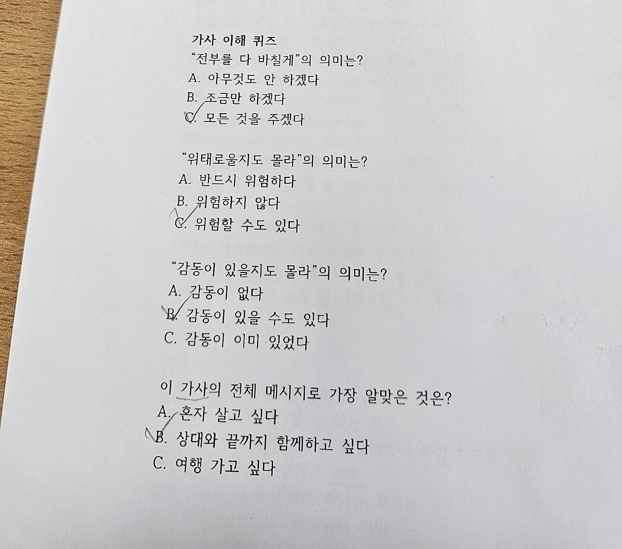 오늘 한국어 수업에서는, 한국어 퀴즈와 노래 가사 프린트, 한국어 동화책, 그리고 대화 주제 카드까지 가져갔다. 그러니 2시간 수업 동안, 퀴즈 30분, 노래 가사 40분, 대화 주제 30분, 동화책 20분 식으로 진행한 셈이다. '무슨 봉사를 그렇게 열심히 수업 준비해 가'라고 생각할 수 있지만, 그렇게 안 하면 2시간 수업이 너무 길게 느껴진다. 내가 힘들다.