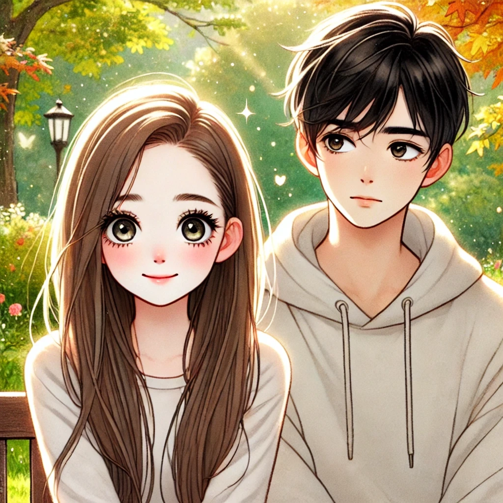 남자가 너무 잘생겼어.... 평범하게...라는 요청 역시 알아듣지 못해서 접었다. 그래도 절대 여자를 안 쳐다보는 남자의 시선 처리, 그 반면 여자의 '헿'하는 모습이 마음에 들어 이걸로 채택했다. 왼쪽 상단의 저 조만한 가로등 하나가 저 곳이 영국의 공원임을 보여준다.