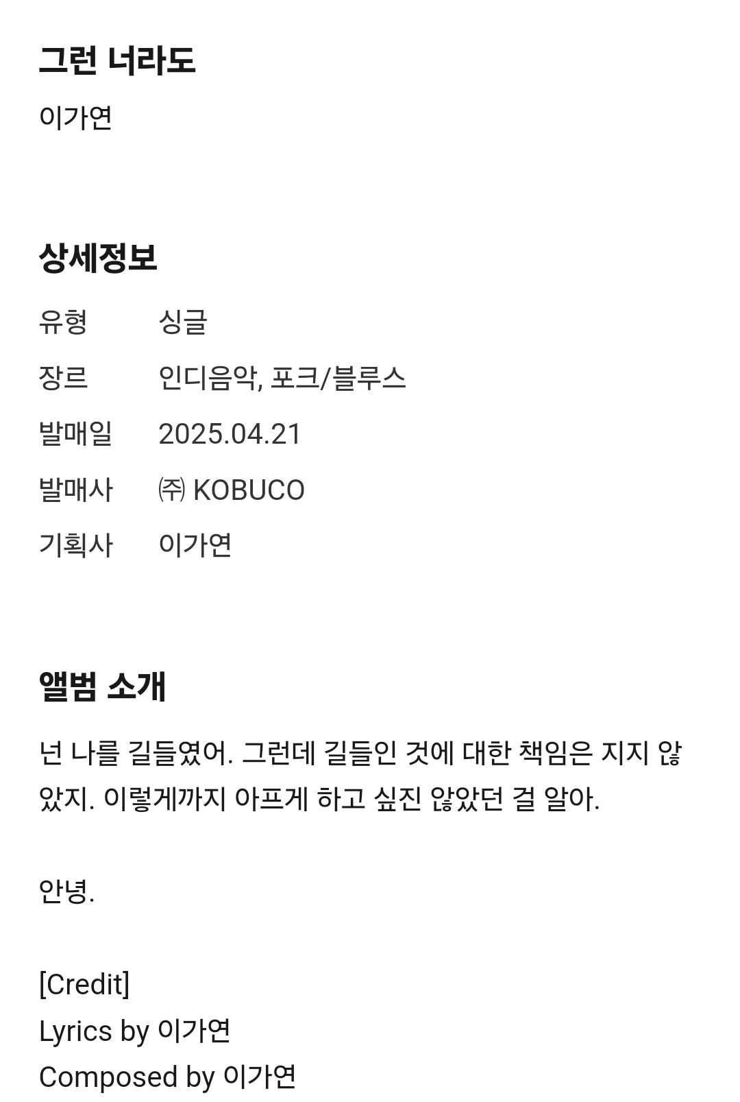 오늘 정오, 이가연의 '그런 너라도'가 발매되었다.