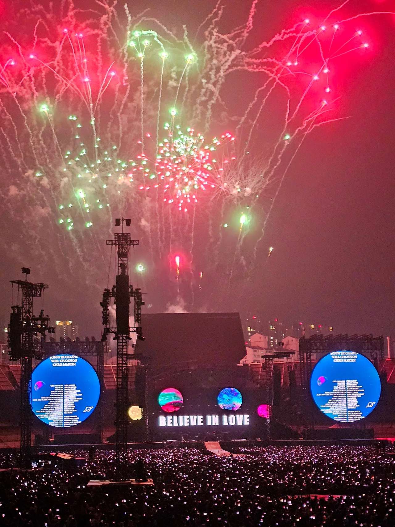 기술적으로는 'Yellow' 때 불빛이 전부 노랑으로 바뀐 것, 곡에 맞추어 불빛이 휘황찬란하게 바뀌는 것, 입구에서 나눠준 종이 안경을 쓰면 사방이 하트로 보이던 것도 신기했다. 또 한국에선 좀처럼 불꽃놀이 볼 일이 전혀 없었는데 간만에 보는 불꽃에 속이 시원해지기도 했다.