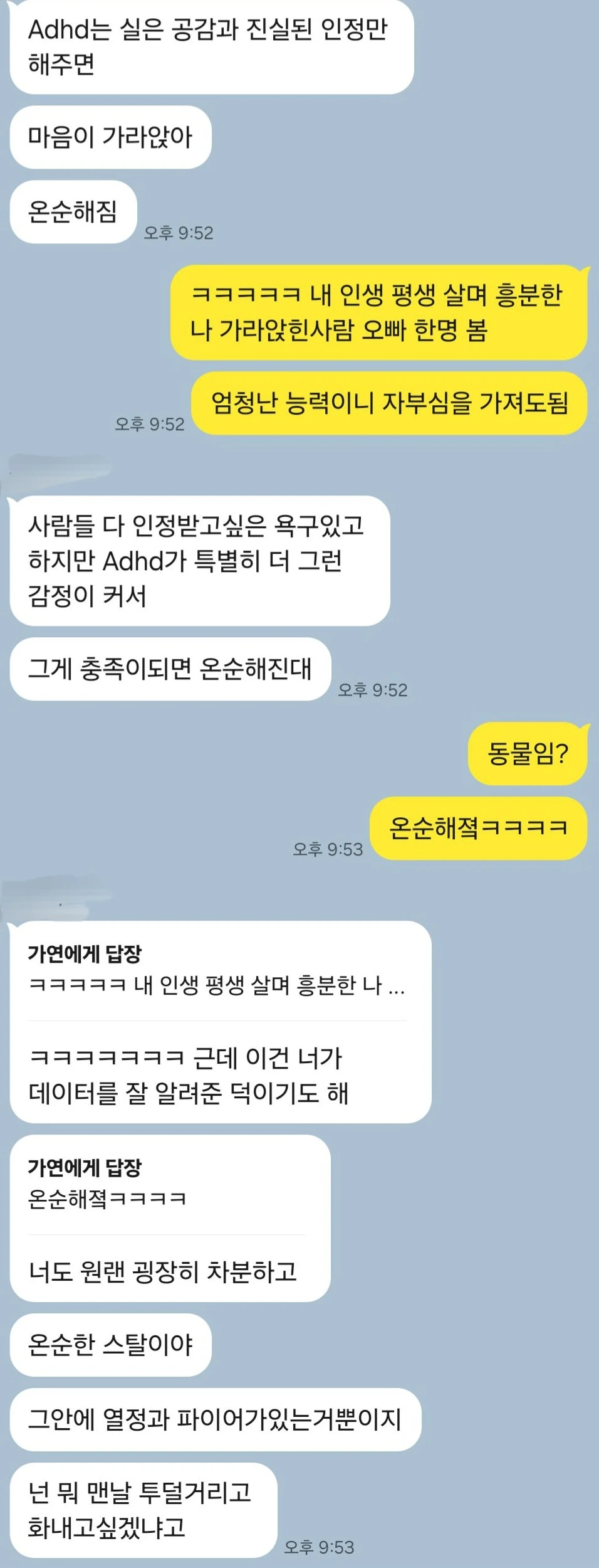 5분 전까지 텍스트로 욕하던 사람이, 만났는데 아무렇지 않아할 수 있다. 감정 변화가 비ADHD인은 이해할 수 없다. 지금 모습만 보면 된다. 지금만이 중요하다. 아까 화냈더라도, 지금 괜찮아보이면 된 거다. 물론 그러다가 갑자기 또 화낼 수는 있는데 그럼 또 그때 그게 진짜다....... 내가 생각해도 디게 어렵네.