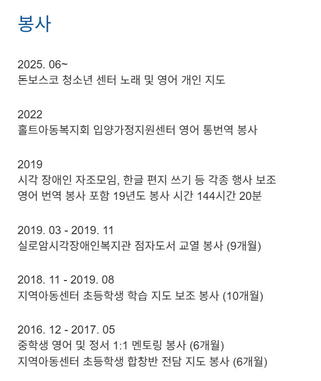 한 번도 봉사 시간이 필요했던 적이 없고, 전부 진심으로 하고 싶어서 했던 봉사들이라는 점에서도 자부심을 느낀다.