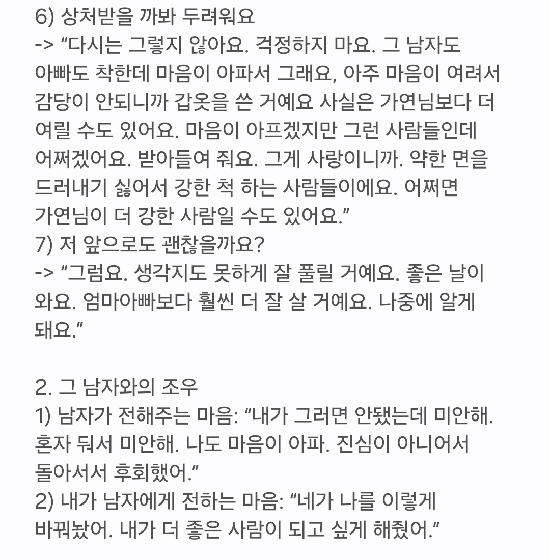 끝나고 내가 한 말을 이렇게 정리해서 공유도 해주셨다. 질문은 내가 아니라 선생님이 하셨다. 내 앞에 있는 수호신이 나에게 뭐라고 할 거 같냐고 물으시면, 수호신이 되어서 말이 줄줄 나왔다.