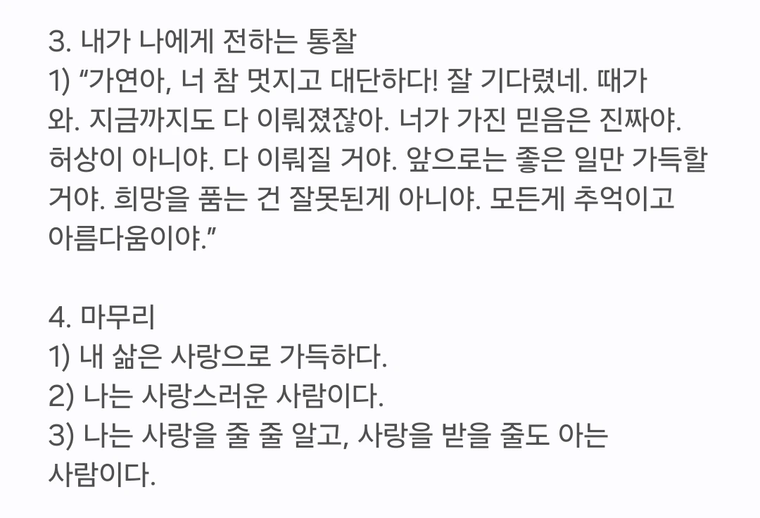 선생님은 "힘든 순간들이 마음에 깊이 남아 있을 수 있지만, 사실은 그만큼 크고 귀한 사랑을 받으셨던 건 아닐까요?"라고 하셨다.