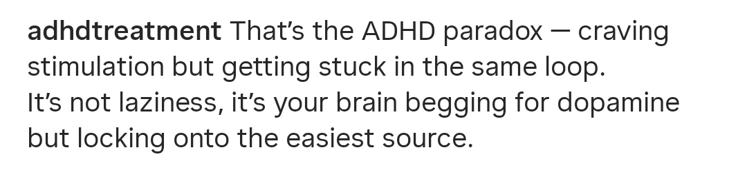 해석 : 그게 ADHD의 역설적인 면이다. 자극을 갈망하지만 같은 루프에 갇히는 거다. 이건 게으름이 아니다. 뇌가 제발 도파민을 달라고 하는데, 가장 쉬운 방법에 갇히고 만다.