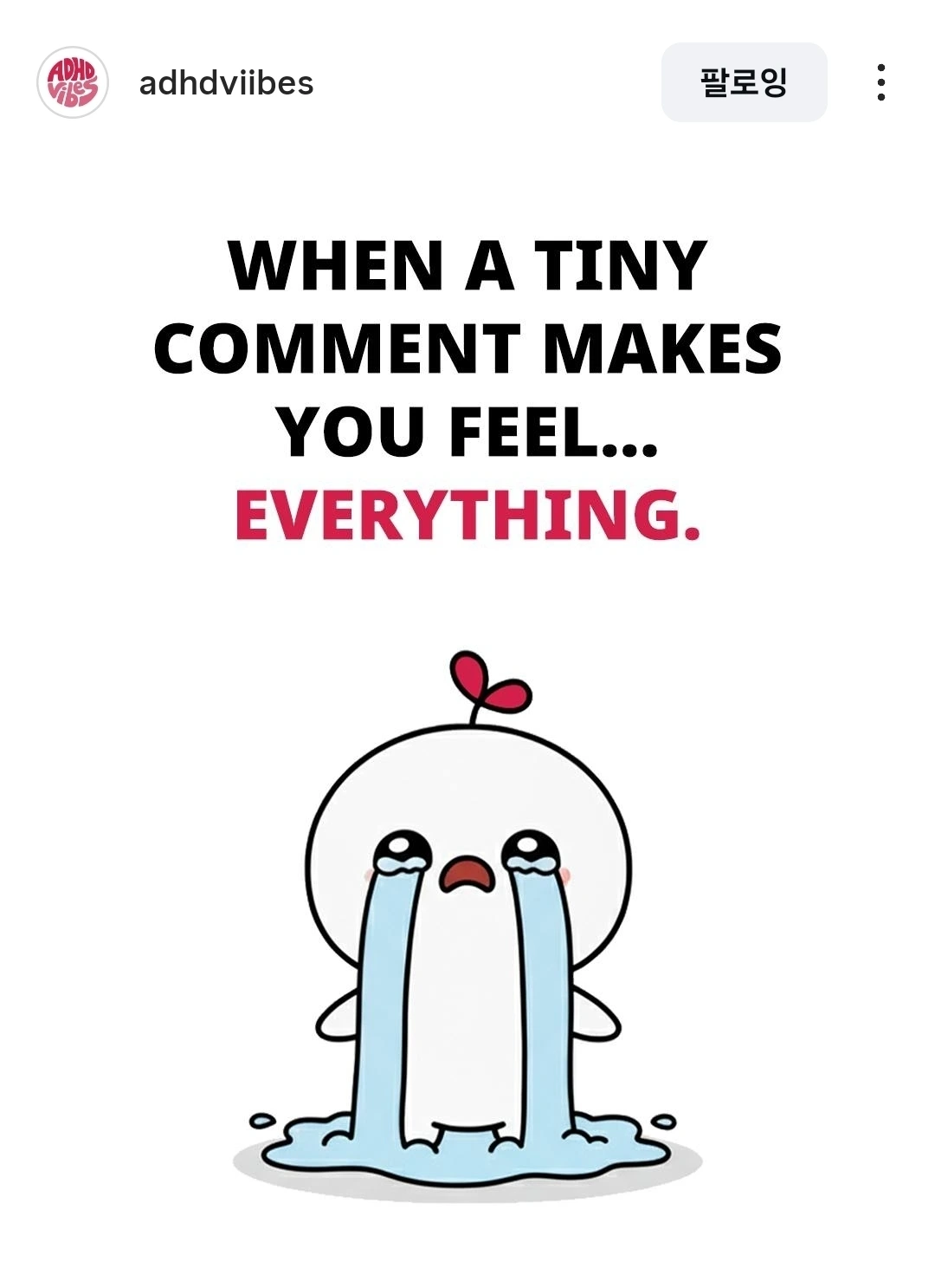 때마침 인스타그램 ADHD 계정에서 'ADHD인은 하나의 악플만 봐도 남들보다 크게 느낀다'는 나의 생각을 뒷받침할 게시글을 찾았다. 그럼 나는 속이 다 시원하다. 이 패턴이 올해 내내 반복되고 있다. 나 혼자 말하면 사람들이 안 믿어줄 거 같은데, 이렇게 자료를 들고 오면 사람들이 믿어줄 것만 같다. (물론 안 통할 사람은 무슨 말을 해도 안 들릴 거란 건 안다. 내 기분이 그렇다.)