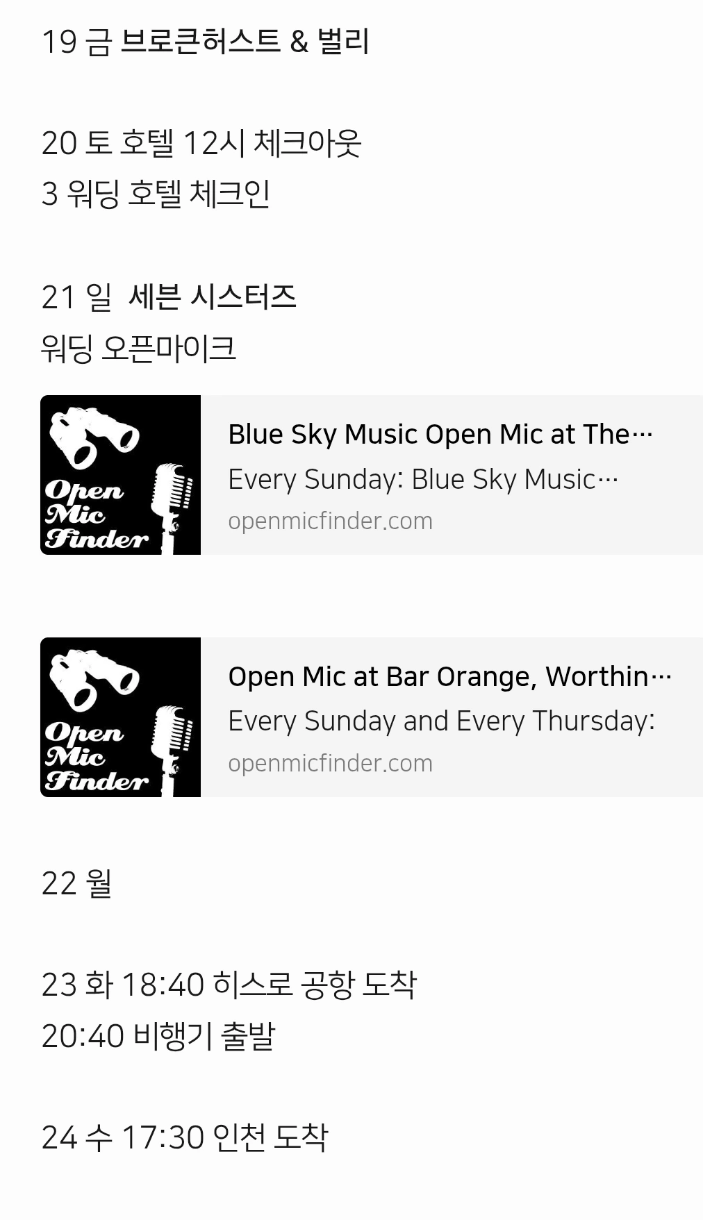 호텔 체크인과 공항 도착만 적혀있는 수준이죠. 소튼 공연하는 거 말고 나머지는 다 선택사항이거든요. 다른 공연은 '어느 펍에 꼭 가야겠다' 이런 것도 없습니다. 사실 메일 보냈는데 전부 응답이 없기도 하고요. 그냥 훗날 2025년 9월의 영국을 떠올렸을 때, 영국 펍과 공연을 떠올렸으면 좋겠어요.