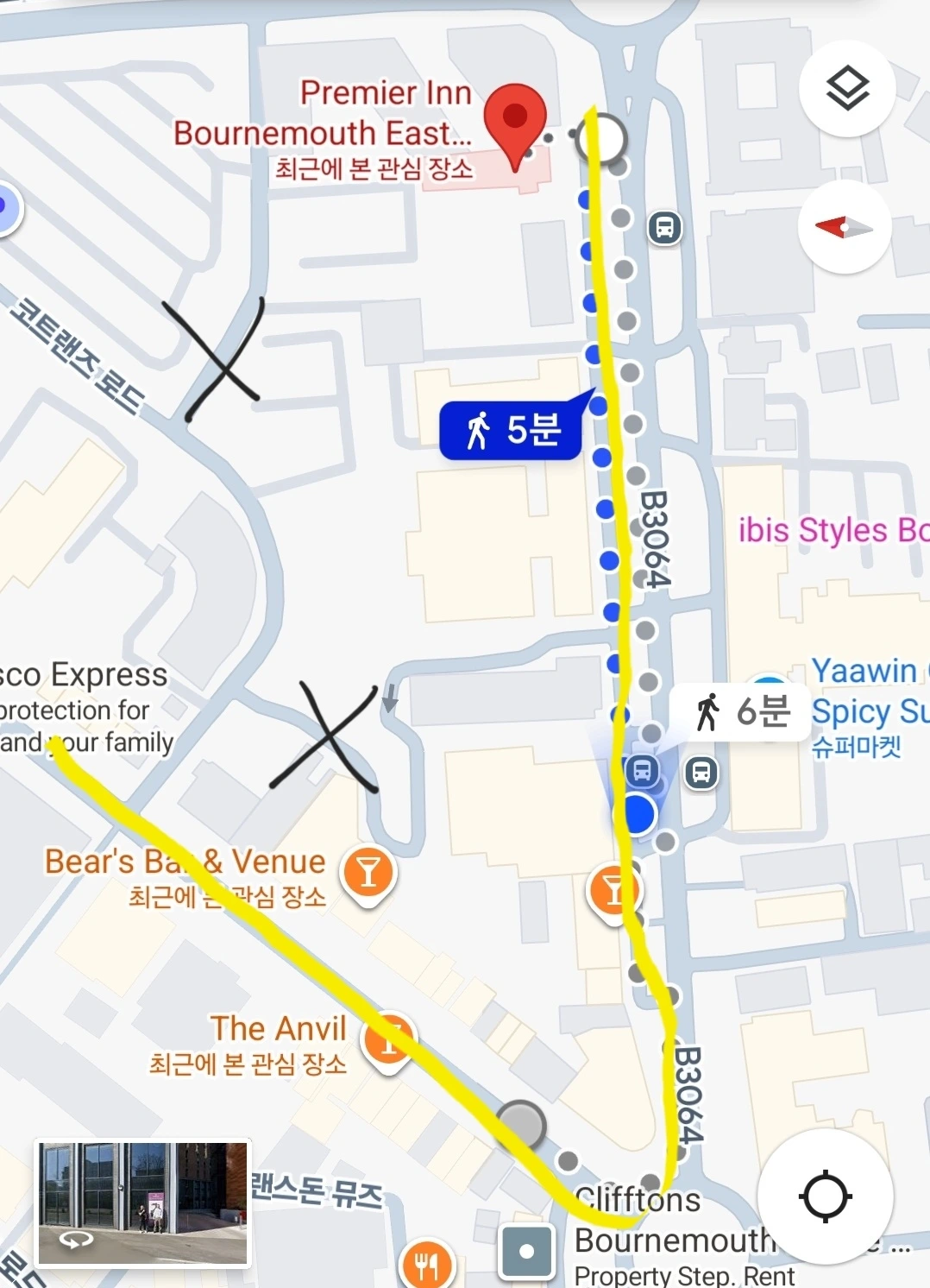 노란 색은 상점들이다. 상점이 모여 있으면 간판이 있어서 사람이 없어도 빛은 있다. 그래서 노란 색으로 표시한 도로만 걸어야 한다. X표 친 구간과 비슷한 길이 앞으로 나오면, 이제 지도만 보고도 내가 밤에 걸을 수 없는 길이란 걸 알아둬야겠다.