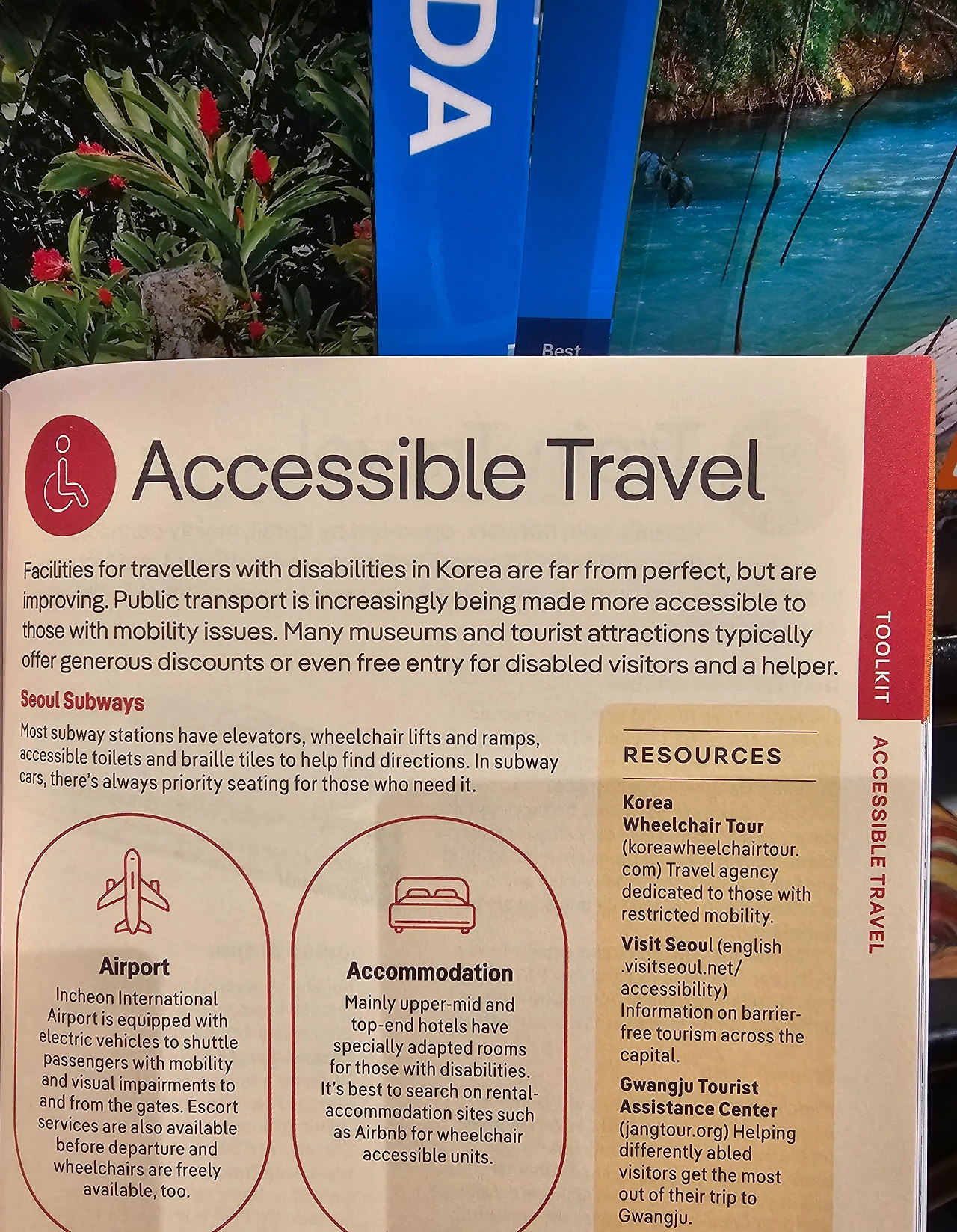 'far from perfect, but are improving'은 영국식으로 해석했을 때 거지 같다는 뜻으로 들린다. 발전하고 있다는 건 훌륭하나, 퍼펙트가 아니라 아직 다니기 어려운 정도라 본다. 당연히 저기 나와있는 것처럼, 인천공항과 비싼 호텔들은 잘 되어있을 거다. 할인 및 무료 입장도, 장애인 등록증 없으면 안 된다고 하는 데가 많을 거다. 한국은 한국 번호가 없어서 본인 인증이 안 되는, 외국인 장애인이 올 거라는 생각을 못하고 시스템을 만든 거 같다는 글을 본 적이 있다.