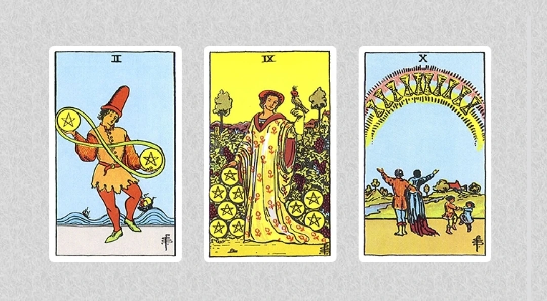 과거-현재-미래 배열을 보면, 과거 카드가 '오 맞아!' 싶어서 카드가 잘 뽑혔다는 걸 알 수 있다. 예를 들어, '내가 저리 이 사랑 매거진에 글을 120개씩 쓰는 일이, 이 우주에 어떤 영향을 미치고 있나' 봤다. 펜타클2-펜타클9-컵10 카드가 나왔다.