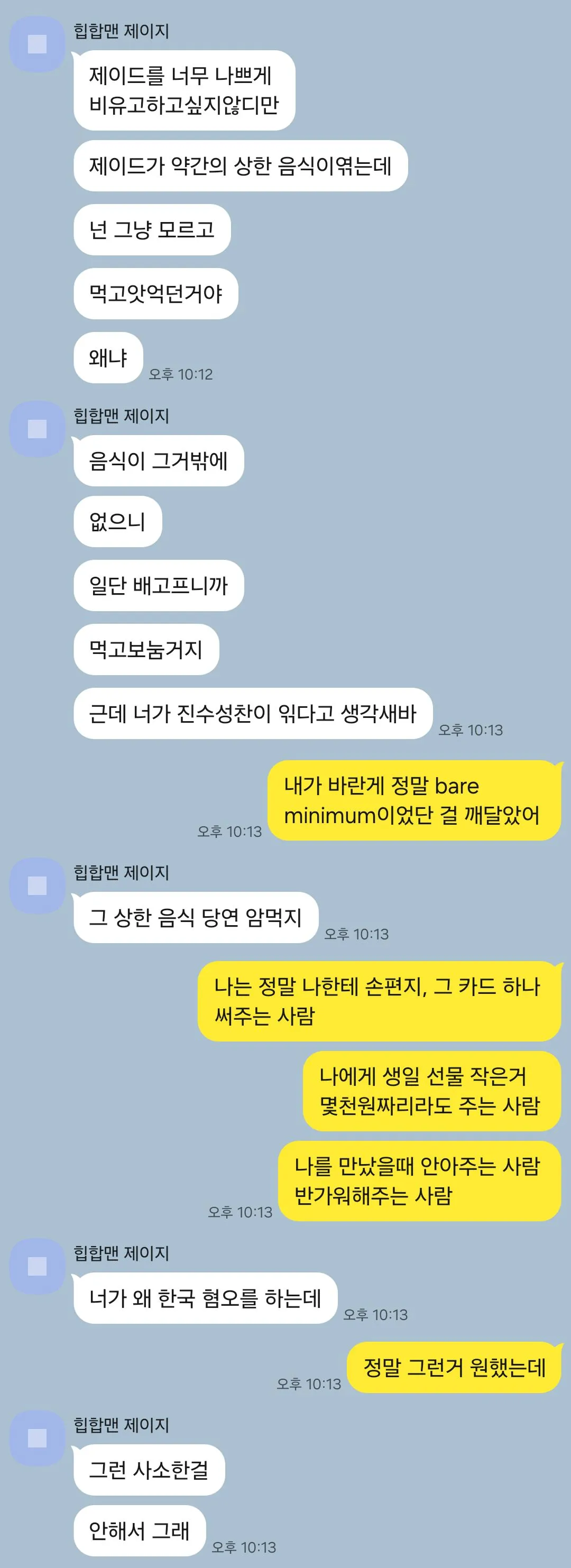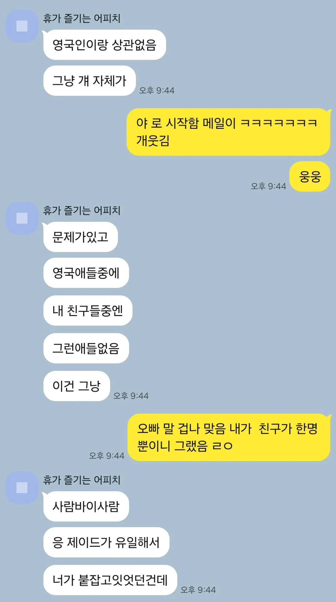 영국 오빠는 또래가 아니다. 이 친구가 진짜 유일한 또래 친구였다. 얘는 내가 그동안 겪은 한국인과 다르게 유일하게 사과를 했다. 말을 안 하고 혼자 꽁하고 있다가 분노하던 것도 아니었다. 잔잔바리 화를 많이 냈었는데, 그때마다 미안하다고는 하지만 절대 고쳐지진 않은 거다. 비슷한 일로 사과를 무한 반복하는 건 진짜 미안한 게 아니다... 나를 위하던 사람이 아니다. 애초에 사과하는 사람을 못 만나봐서 이렇게 되었다.