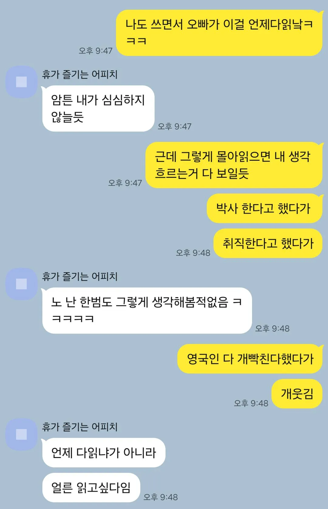 누군가는 "카톡 대화한 걸 아무거나 캡쳐해서 글을 올리면, 그때그때 허락은 받는 거냐. 싫지 않나."싶을 수도 있다. 이 분과의 대화는 전체 사용 허락을 이미 받아서 1%도 신경 쓰이지 않는다. 본인 언급된 글들을 종이로 인쇄해서 모아두던 분이다. 정말 그런 사람만 '친구'할 수 있는 거 같다.