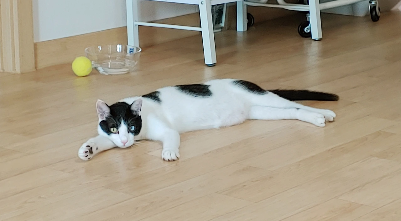 집사가 흔드는 낚싯대에 전심을 다해 점프를 하고, 공중돌기도 하고, 앞발을 재빠르게 허공을 향해 흔들면서 이리저리 열심히 뛰어다녔다. "그만" 하는 집사의 목소리에 기진맥진하여 벌러덩 하고 눕더니, 숨을 헐떡거렸다.