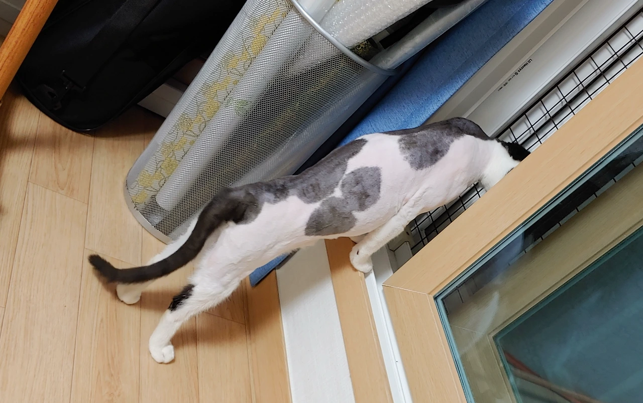 의사 선생님의 조언과 반려견을 오랜 시간 키우고 있는 친구의 조언을 참고로 하여, 큰마음먹고 이발을 시작하였다. 아이는 생전 처음으로 들이대는 기계소리에 털이 우수수 바닥에 흩어지는 모습을 보고 넋이 나간나 싶을 정도로 얼음이 되더니, 이내 정신을 차리고는 예민한 청력의 냥이족의 후예답게 기계음을 피해서 요리조리 잘도 빠져나갔다. 달래고 어르고 하면서 이틀에 걸쳐서 털을 밀었다. 머리와 네발은 남겨두고 행여나 아이가 다칠까 온 신경을 다해 조심하면서 털과의 전쟁을 마무리하였다.