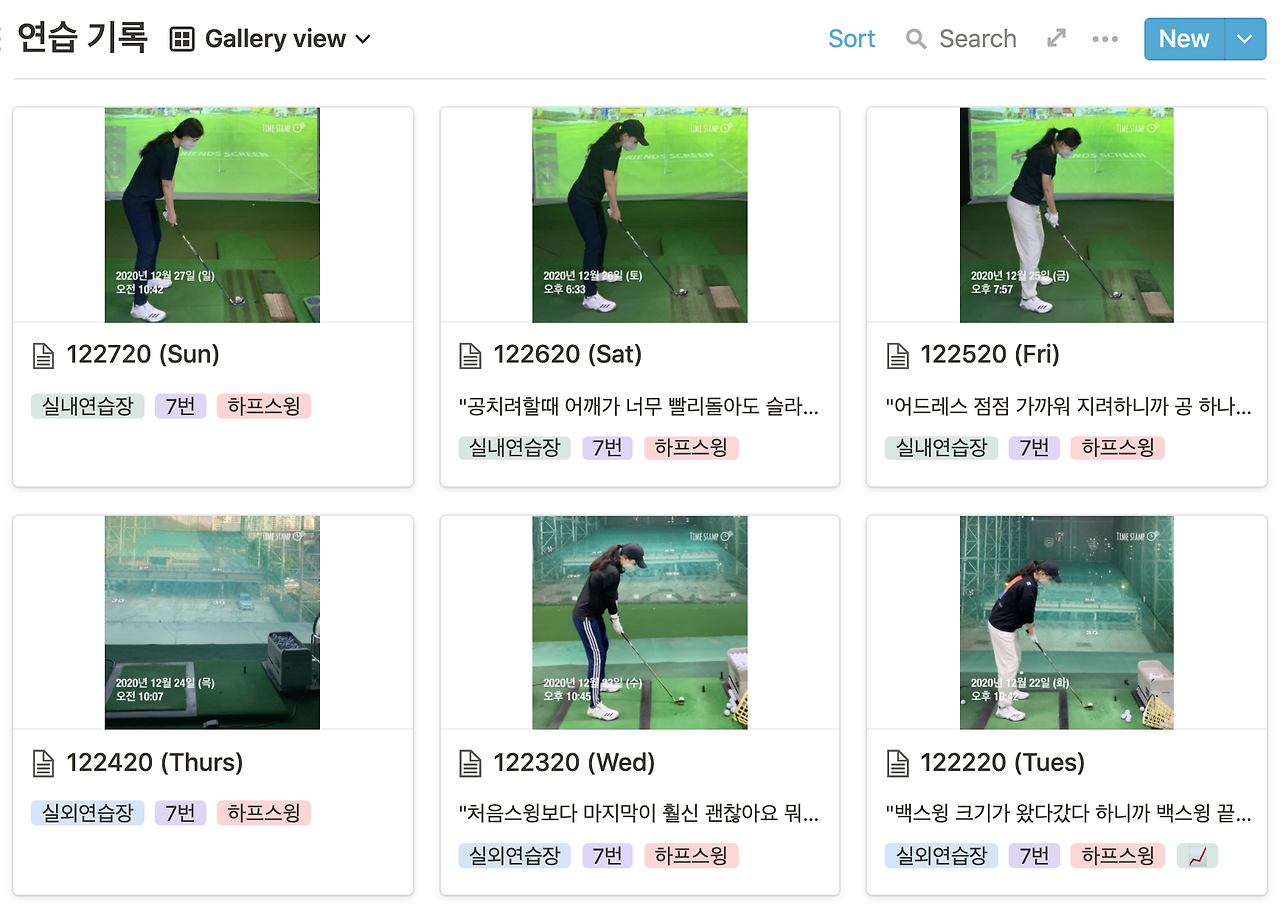 그러다 코로나가 2.5단계로 격상되면서 실내연습장이 닫아 혼자 연습을 해야 하는 상황을 마주했다. 지금의 모멘텀을 놓치고 싶지 않아 바로 실외 연습장을 끊고, 삼각대 하나를 들고 거진 매일 연습장을 갔다. 민망했지만, 매일 스윙 연습 영상을 촬영해서 프로님께 보냈다. 그리고 그 과정에서 나의 자세를 하루에도 수십 번씩 보게 되었다.
