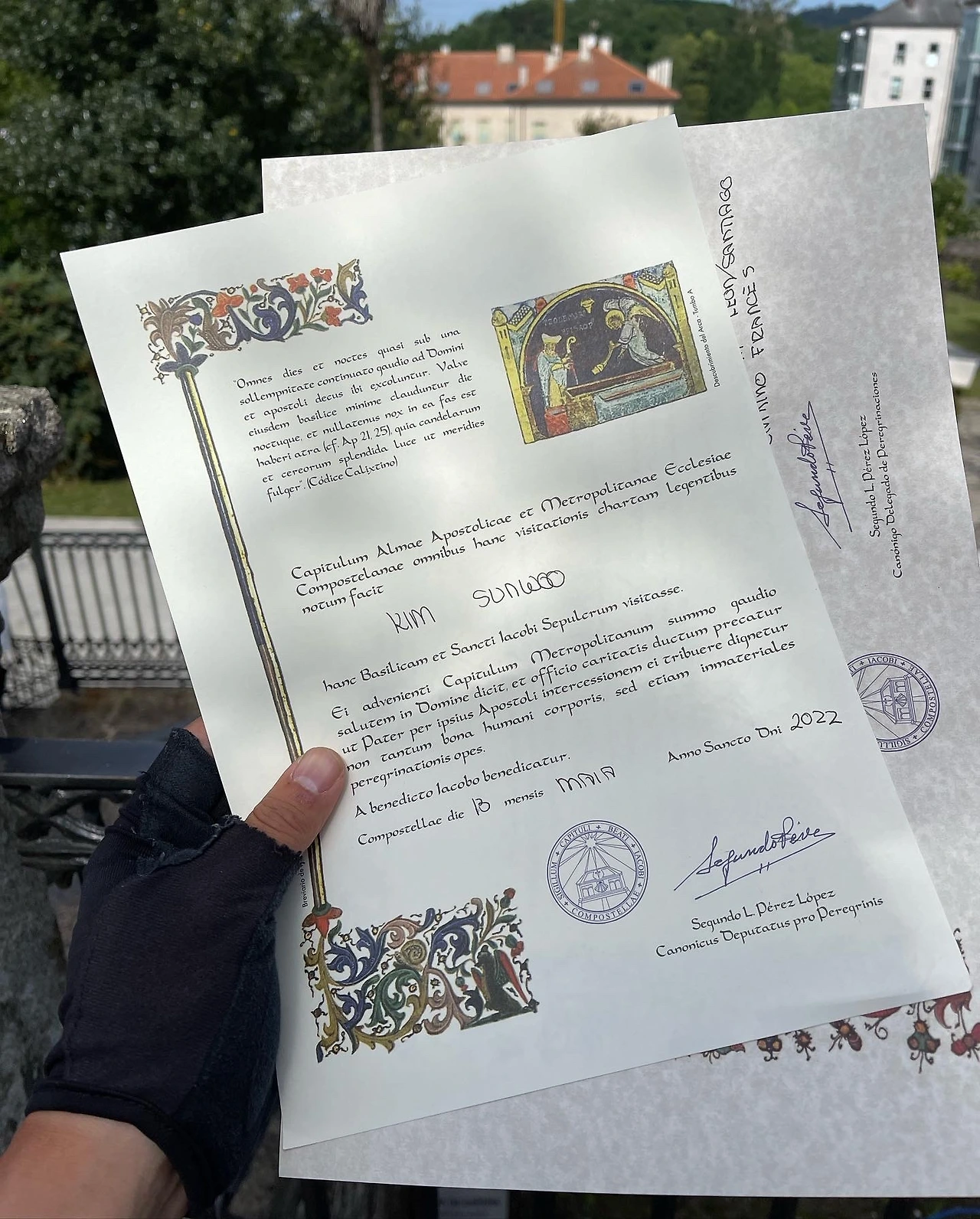 따뜻한 오전의 햇볕이 쏟아지는 대성당 광장에는 세상의 모든 기쁨이 다 모여있는 것 같았다. 사람들은 얼싸안고, 환호하고, 이를 드러내고 웃으며 사진을 찍었다. 누군가는 한쪽 무릎을 꿇고 성당을 바라보며 묵상하고 있었고, 어떤 이는 감정을 주체하지 못하고 오열하기도 했다. 나는 지나가던 이름 모를 순례자에게 부탁해 대성당을 배경으로 내 사진을 남겼다. 그는 내게 축하한다며 엄지를 세워주었다. 나는 껴안을 사람도, 함께 환호할 친구도 없었지만, 기뻐하는 사람들을 바라보는 일 만으로도 마음이 따뜻해져서, 광장 한편에 잠시 배낭을 내려놓고 꽤 오랜 시간 동안 회랑의 돌기둥에 기대앉아 새로 도착하는 사람들과, 기쁨의 세리머니를 마치고 자리를 떠나는 사람들을 지켜보았다.