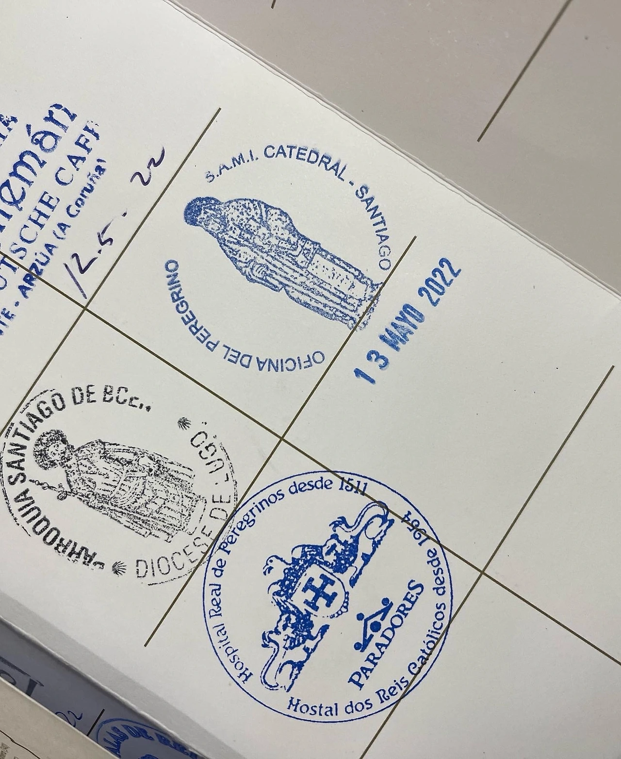 순례길은 100킬로미터 이상을 걸으면 순례자 인증을 해줍니다. 산티아고 대성당 근처 순례자 사무소에서 순례자 여권에 찍힌 도장을 확인하고 인증서를 발급해주는데, 100킬로미터 구간부터는 하루에 2개의 쎄요(도장)를 받아야 한다는 룰이 있기는 하지만, 그걸 아주 엄격하게 확인하지는 않는 것 같습니다. 최근에는 순례자 사무소에 하루에 도착하는 순례자가 1,300명을 넘는다고 합니다. 그래선지 어제는 오전에 도착했음에도 불구하고 30분 정도 줄을 서서 일을 볼 수 있었습니다. 2유로를 내면 순례자 인증서가 구겨지지 않도록 지관에 넣어 주고, 3유로를 더 내면 몇 킬로미터를 얼마나 걸었는지 거리가 기입된 추가 인증서를 발급해줍니다. 9년 전에는 3유로가 아까워서 그걸 못 받았던 게 아쉬워서 이번에는 둘 다 받았습니다. 내 인증서를 발급해준 사무소의 할머니는 따뜻한 웃음을 지으며 내게 몇 번이나 "콩크레츄레이션!" 하며 진심으로 축하해주었습니다.
